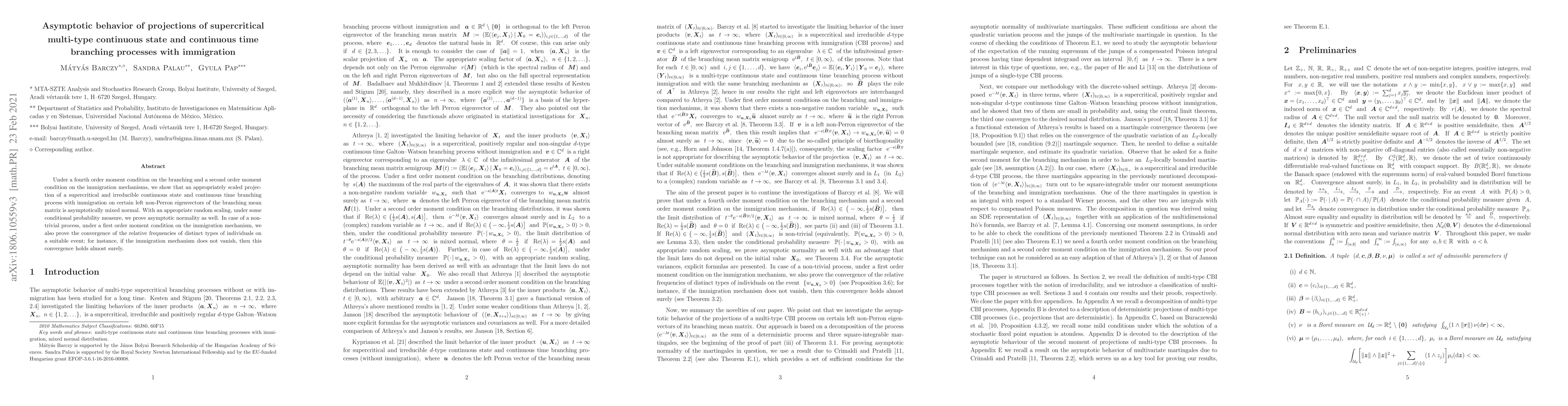 This paper investigates the asymptotic behavior of projections in supercritical multi-type branching processes with immigration, proving that scaled projections converge to mixed normal distributions under certain moment conditions. It also demonstrates the convergence of relative frequencies of distinct types under specific conditions.
