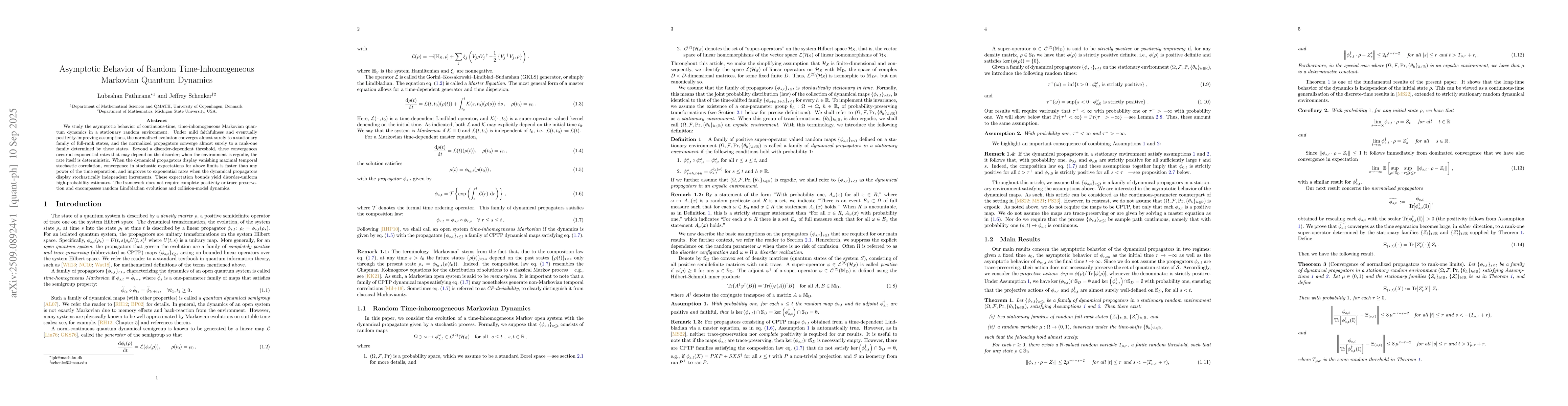 We study the asymptotic behavior of continuous-time, time-inhomogeneous Markovian quantum dynamics in a stationary random environment. Under mild faithfulness and eventually positivity-improving assumptions, the normalized evolution converges almost surely to a stationary family of full-rank states, and the normalized propagators converge almost surely to a rank-one family determined by these states. Beyond a disorder-dependent threshold, these convergences occur at exponential rates that may depend on the disorder; when the environment is ergodic, the rate itself is deterministic. When the dynamical propagators display vanishing maximal temporal stochastic correlation, convergence in stochastic expectations for the above limits is faster than any power of the time separation, and improves to exponential rates when the dynamical propagators display stochastically independent increments. These expectation bounds yield disorder-uniform high-probability estimates. The framework does not require complete positivity or trace preservation and encompasses random Lindbladian evolutions and collision-model dynamics.