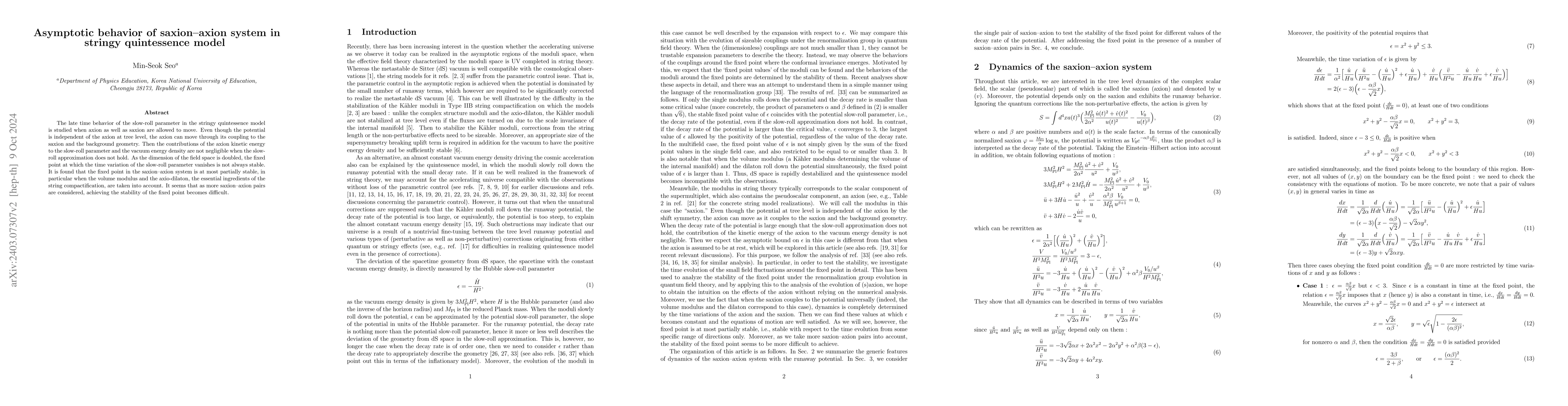 The paper presents a detailed analysis of the saxion-axion system in stringy quintessence models, examining the stability of fixed points and the role of axion kinetic energy in vacuum energy density.