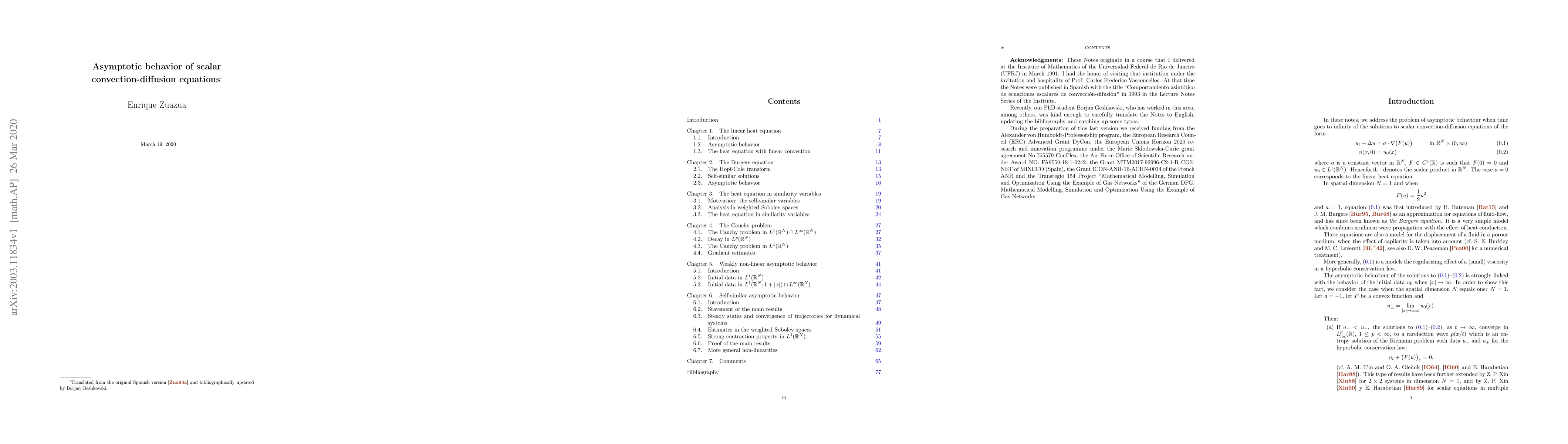 In these lecture notes, we address the problem of large-time asymptotic behaviour of the solutions to scalar convection-diffusion equations set in ${R}^N$. The large-time asymptotic behaviour of the solutions to many convection-diffusion equations is strongly linked with the behavior of the initial data at infinity. In fact, when the initial datum is integrable and of mass $M$, the solutions to the equations under consideration oftentimes behave like the associated self-similar profile of mass $M$, thus emphasising the role of scaling variables in these scenarios. However, these equations can also manifest other asymptotic behaviors, including weakly non-linear, linear or strongly non-linear behavior depending on the form of the convective term. We give an exhaustive presentation of several results and techniques, where we clearly distinguish the role of the spatial dimension and the form of the nonlinear convective term. Translation (English) by Borjan Geshovski