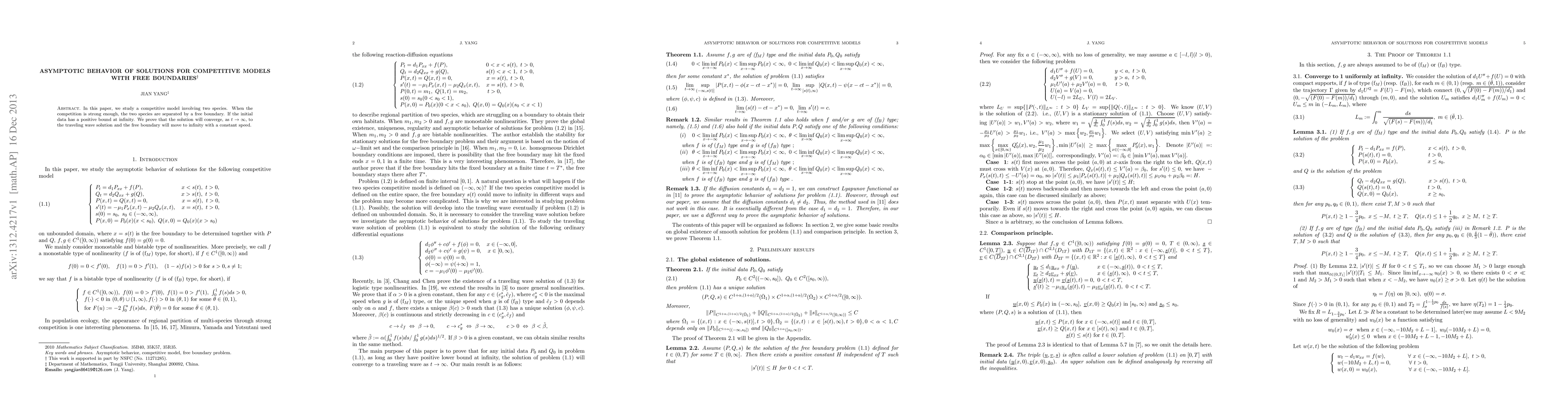 In this paper, we study a competitive model involving two species. When the competition is strong enough, the two species are separated by a free boundary. If the initial data has a positive bound at infinity. We prove that the solution will converge, as $t\rightarrow \infty$, to the traveling wave solution and the free boundary will move to infinity with a constant speed.