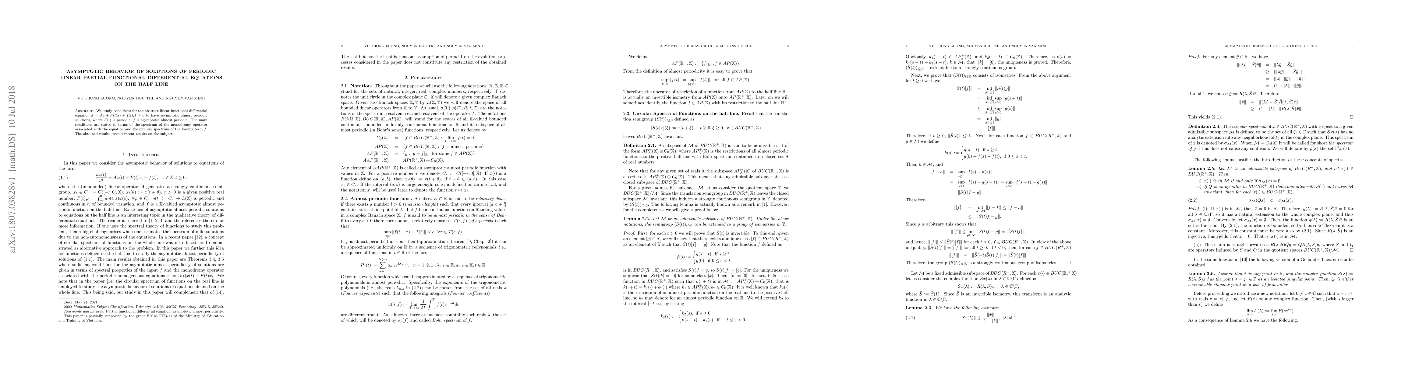This paper explores conditions for asymptotic almost periodic solutions of a linear partial functional differential equation on the half line, focusing on the role of the spectrum of the monodromy operator and the circular spectrum of the forcing term. The findings extend previous results in this area.