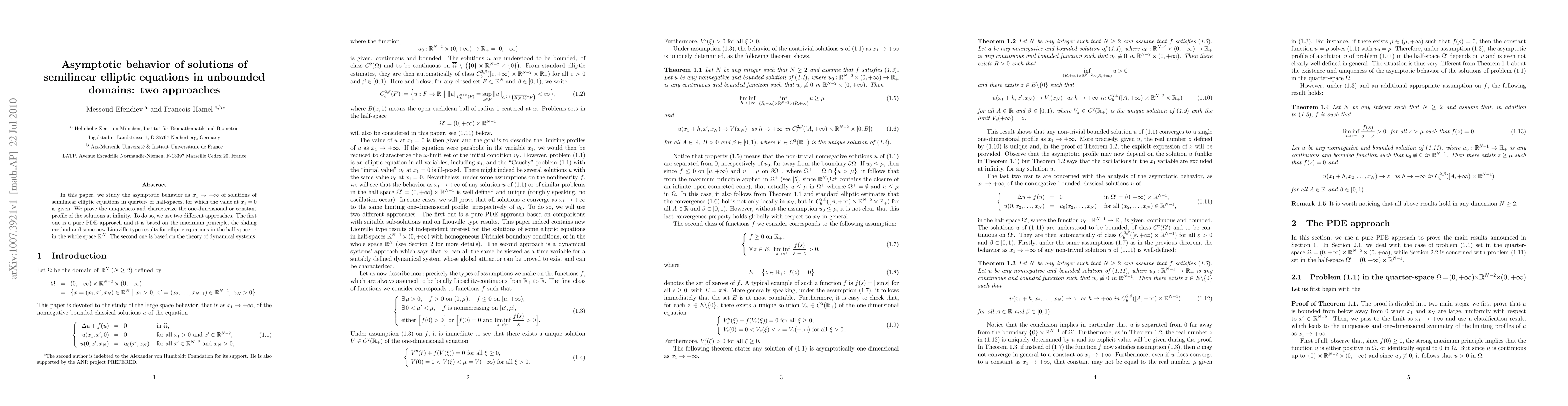 This paper explores the asymptotic behavior of semilinear elliptic equation solutions in unbounded domains, proving the uniqueness and characterizing their profiles at infinity using two distinct methods: a PDE approach involving the maximum principle and a dynamical systems approach.