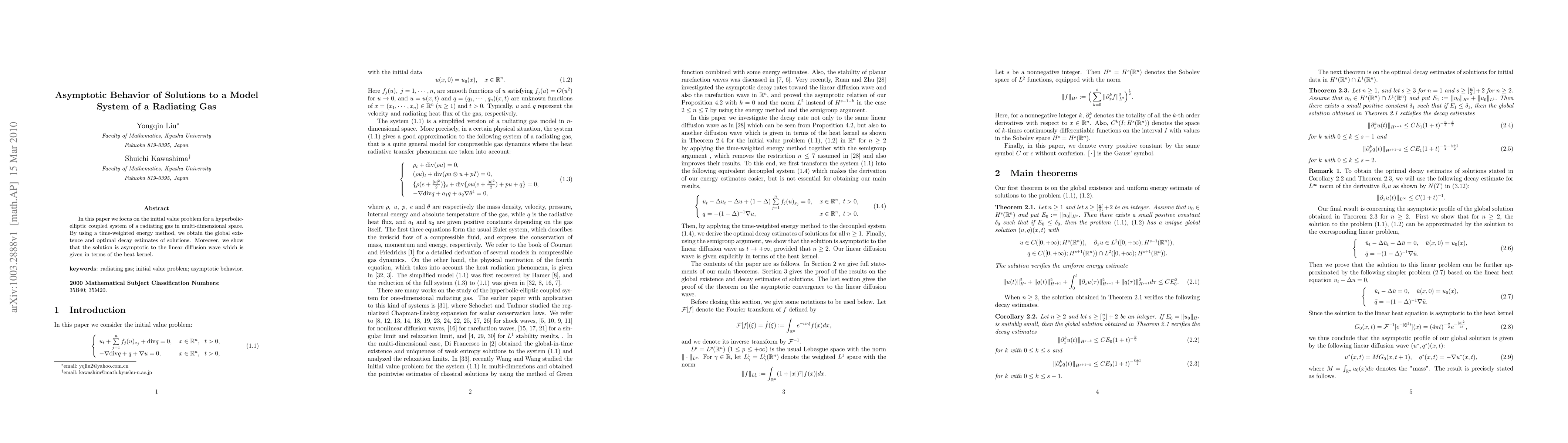 In this paper we focus on the initial value problem for a hyperbolic-elliptic coupled system of a radiating gas in multi-dimensional space. By using a time-weighted energy method, we obtain the global existence and optimal decay estimates of solutions. Moreover, we show that the solution is asymptotic to the linear diffusion wave which is given in terms of the heat kernel.
