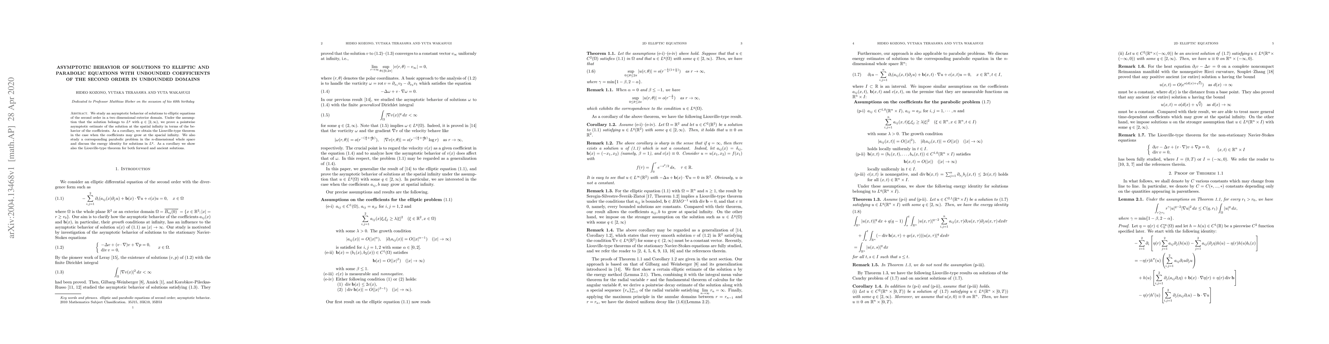 This paper investigates the asymptotic behavior of solutions to elliptic and parabolic equations with unbounded second-order coefficients in unbounded domains. It proves pointwise asymptotic estimates for elliptic solutions in a two-dimensional exterior domain and derives Liouville-type theorems for both elliptic and parabolic cases.