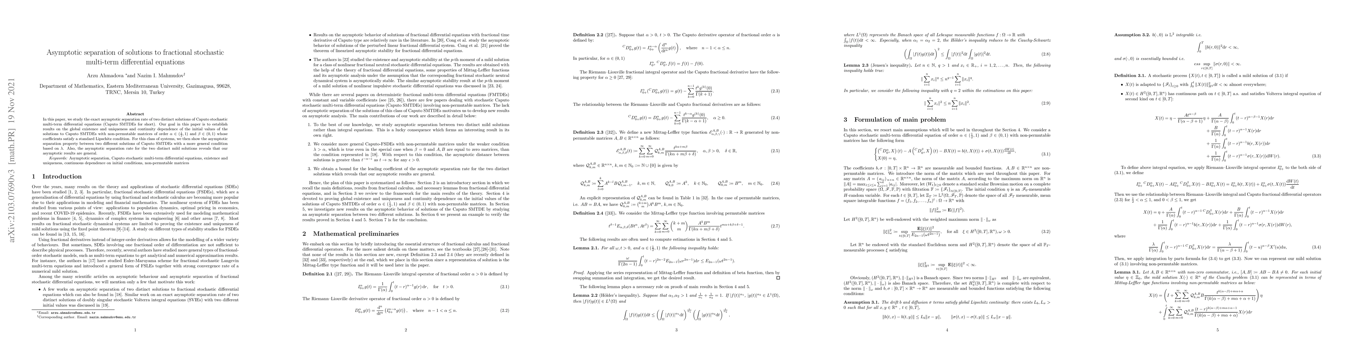 In this paper, we study the exact asymptotic separation rate of two distinct solutions of Caputo stochastic multi-term differential equations (Caputo SMTDEs for short). Our goal in this paper is to establish results on the global existence and uniqueness and continuity dependence of the initial values of the solutions to Caputo SMTDEs with non-permutable matrices of order $\alpha \in (\frac{1}{2},1)$ and $\beta \in (0,1)$ whose coefficients satisfy a standard Lipschitz condition. For this class of systems, we then show the asymptotic separation property between two different solutions of Caputo SMTDEs with a more general condition based on $\lambda$. Also, the asymptotic separation rate for the two distinct mild solutions reveals that our asymptotic results are general.