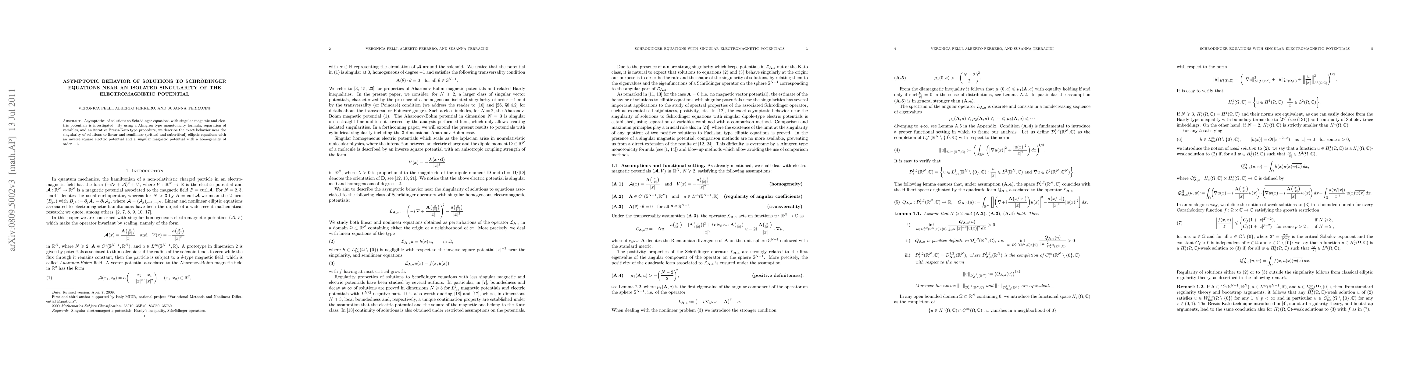 Asymptotics of solutions to Schroedinger equations with singular magnetic and electric potentials is investigated. By using a Almgren type monotonicity formula, separation of variables, and an iterative Brezis-Kato type procedure, we describe the exact behavior near the singularity of solutions to linear and semilinear (critical and subcritical) elliptic equations with an inverse square electric potential and a singular magnetic potential with a homogeneity of order -1.