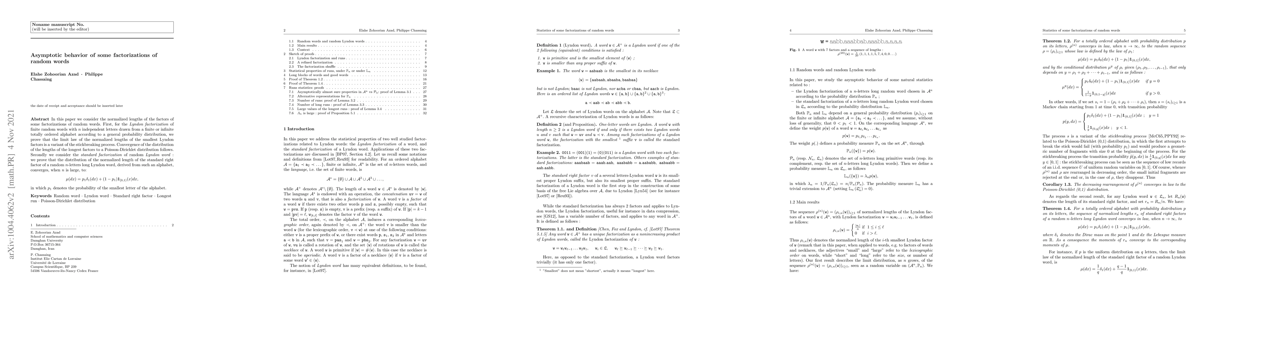 In this paper we consider the normalized lengths of the factors of some factorizations of random words. First, for the \emph{Lyndon factorization} of finite random words with $n$ independent letters drawn from a finite or infinite totally ordered alphabet according to a general probability distribution, we prove that the limit law of the normalized lengths of the smallest Lyndon factors is a variant of the stickbreaking process. Convergence of the distribution of the lengths of the longest factors to a Poisson-Dirichlet distribution follows. Secondly we consider the \emph{standard factorization} of random \emph{Lyndon word} : we prove that the distribution of the normalized length of the standard right factor of a random $n$-letters long Lyndon word, derived from such an alphabet, converges, when $n$ is large, to: $$\mu(dx)=p_1 \delta_{1}(dx) + (1-p_1) \mathbf{1}_{[0,1)}(x)dx,$$ in which $p_1$ denotes the probability of the smallest letter of the alphabet.