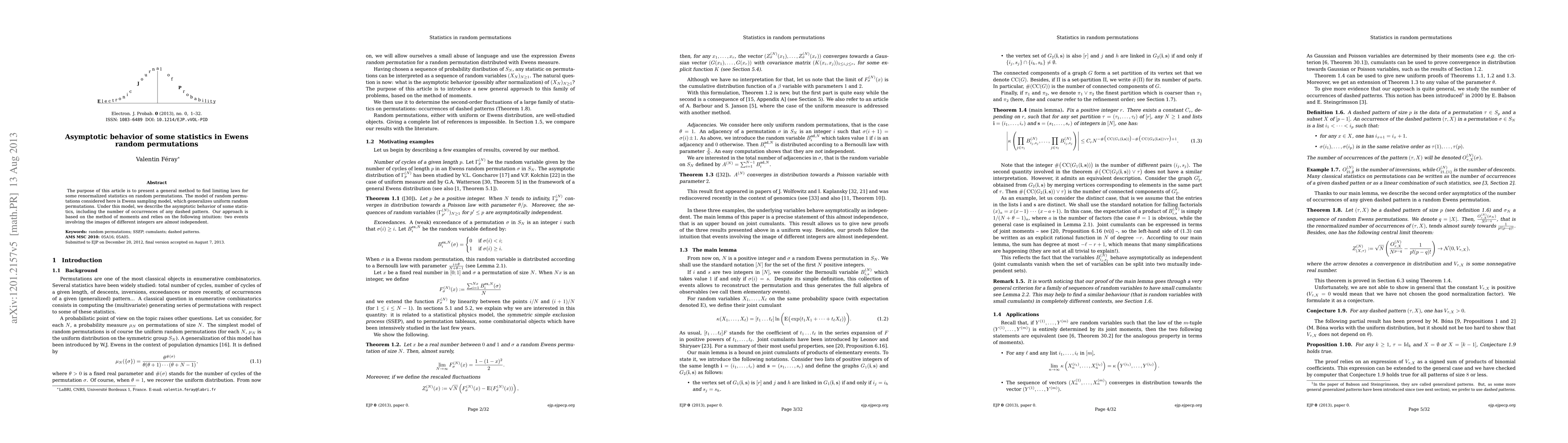This paper develops a method to determine the limiting laws for various renormalized statistics in Ewens random permutations, using the method of moments and the independence intuition between events involving different integers. The study focuses on the asymptotic behavior of a wide range of statistics, including the frequency of specific dashed patterns.