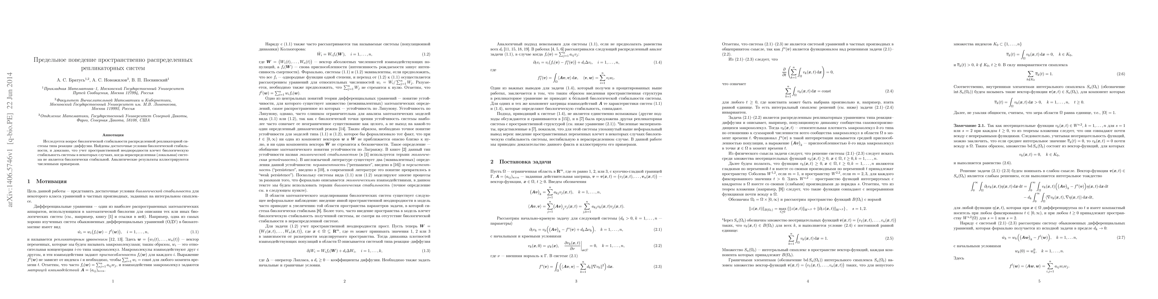 The paper presents a mathematical analysis of replicator systems, proving conditions for biological stability in distributed systems and demonstrating how spatial distribution can stabilize systems that are unstable in a non-distributed form.