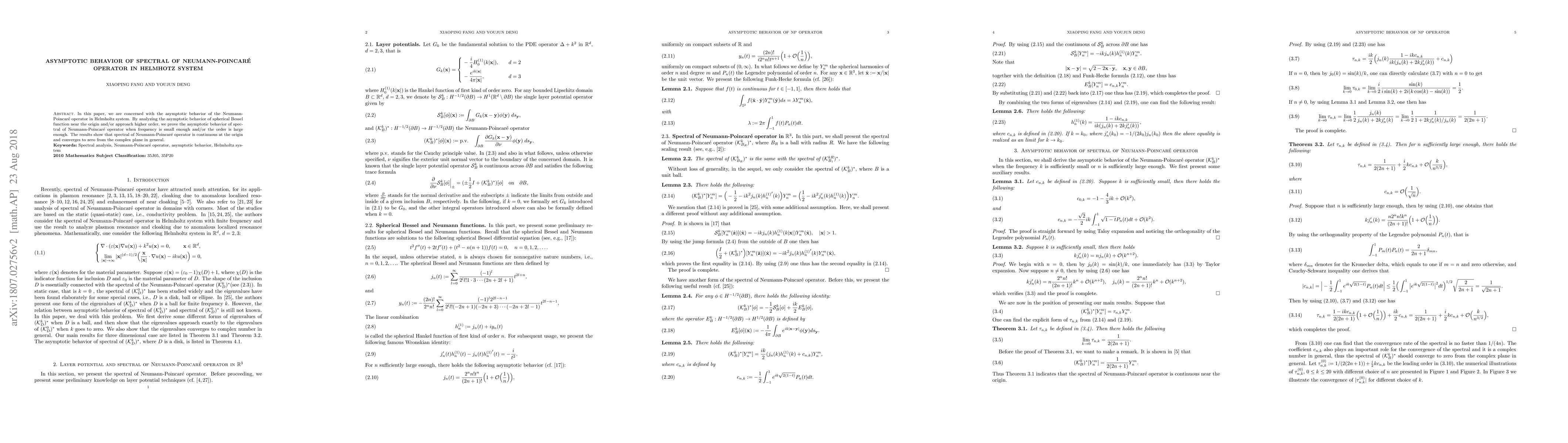 The paper analyzes the asymptotic behavior of the Neumann-Poincare operator for the Helmholtz system, focusing on the spherical Bessel function's behavior near the origin and at higher orders.