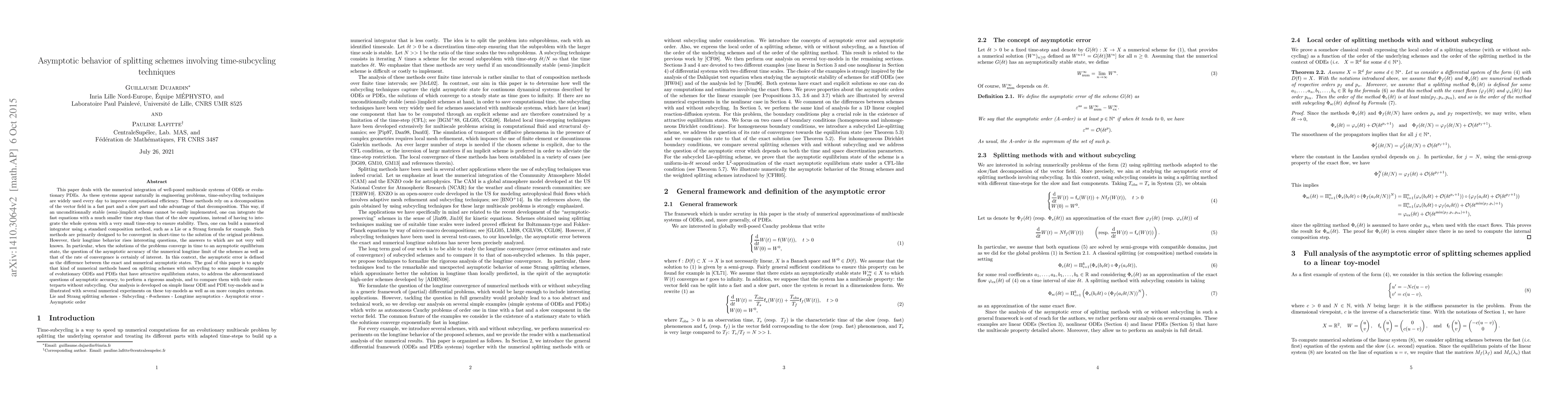 This paper deals with the numerical integration of well-posed multiscale systems of ODEs or evolutionary PDEs. As these systems appear naturally in engineering problems, time-subcycling techniques are widely used every day to improve computational efficiency. These methods rely on a decomposition of the vector field in a fast part and a slow part and take advantage of that decomposition. This way, if an unconditionnally stable (semi-)implicit scheme cannot be easily implemented, one can integrate the fast equations with a much smaller time step than that of the slow equations, instead of having to integrate the whole system with a very small time-step to ensure stability. Then, one can build a numerical integrator using a standard composition method, such as a Lie or a Strang formula for example. Such methods are primarily designed to be convergent in short-time to the solution of the original problems. However, their longtime behavior rises interesting questions, the answers to which are not very well known. In particular, when the solutions of the problems converge in time to an asymptotic equilibrium state, the question of the asymptotic accuracy of the numerical longtime limit of the schemes as well as that of the rate of convergence is certainly of interest. In this context, the asymptotic error is defined as the difference between the exact and numerical asymptotic states. The goal of this paper is to apply that kind of numerical methods based on splitting schemes with subcycling to some simple examples of evolutionary ODEs and PDEs that have attractive equilibrium states, to address the aforementioned questions of asymptotic accuracy, to perform a rigorous analysis, and to compare them with their counterparts without subcycling. Our analysis is developed on simple linear ODE and PDE toy-models and is illustrated with several numerical experiments on these toy-models as well as on more complex systems. Lie and