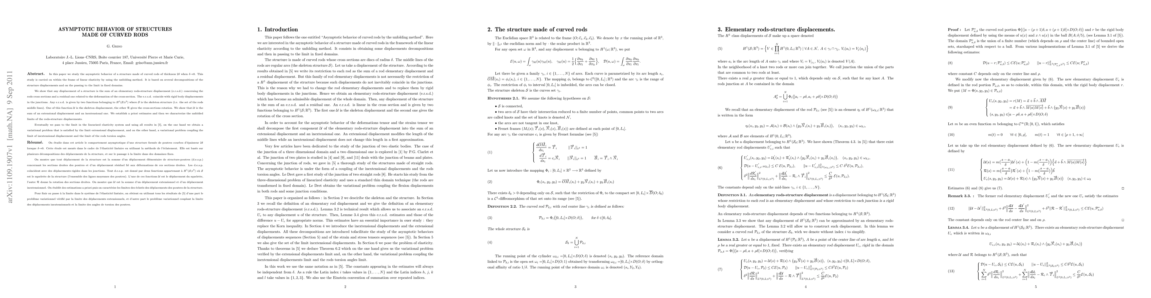 In this paper we study the asymptotic behavior of a structure made of curved rods of thickness 2\delta when \delta rightarrow 0. This study is carried on within the frame of linear elasticity by using the unfolding method. It is based on several decompositions of the structure displacements and on the passing to the limit in fixed domains. We show that any displacement of a structure is the sum of an elementary rods-structure displacement (e.r.s.d.) concerning the rods cross sections and a residual one related to the deformation of the cross-section. The e.r.s.d. coincide with rigid body displacements in the junctions. Any e.r.s.d. is given by two functions belonging to H1 (S;R3) where S is the skeleton structure (i.e. the set of the rods middle lines). One of this function U is the skeleton displacement, the other R gives the cross-sections rotation. We show that U is the sum of an extensional displacement and an inextensional one. We establish a priori estimates and then we characterize the unfolded limits of the rods-structure displacements. Eventually we pass to the limit in the linearized elasticity system and using all results in [5], on the one hand we obtain a variational problem that is satisfied by the limit extensional displacement, and on the other hand, a variational problem coupling the limit of inextensional displacement and the limit of the rods torsion angles.