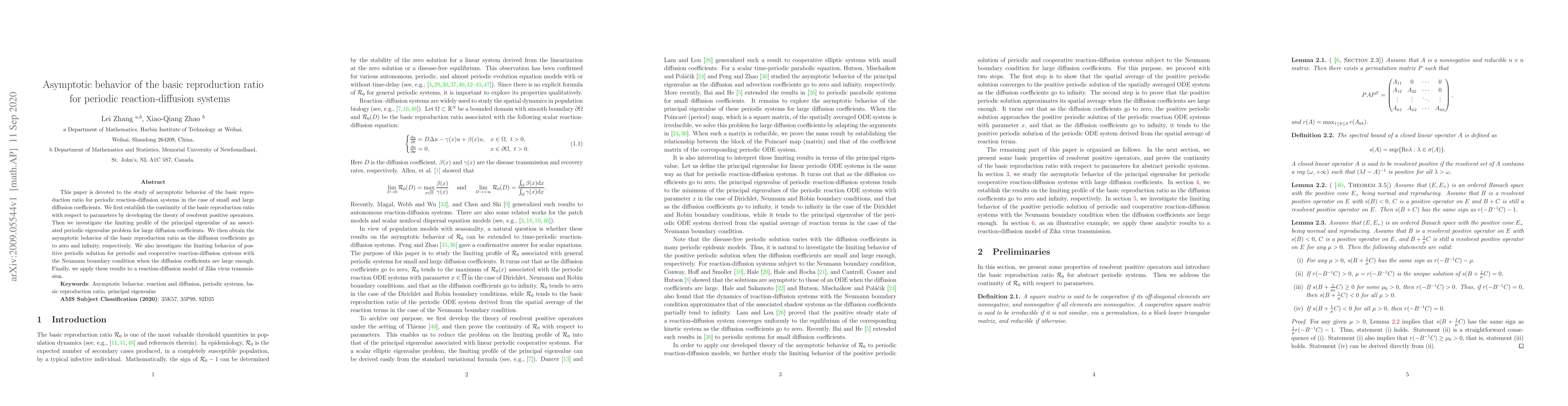 This paper examines the asymptotic behavior of the basic reproduction ratio in periodic reaction-diffusion systems for varying diffusion coefficients, establishing continuity and determining the limiting profiles for large and small diffusion coefficients. It also applies these findings to a Zika virus transmission model.