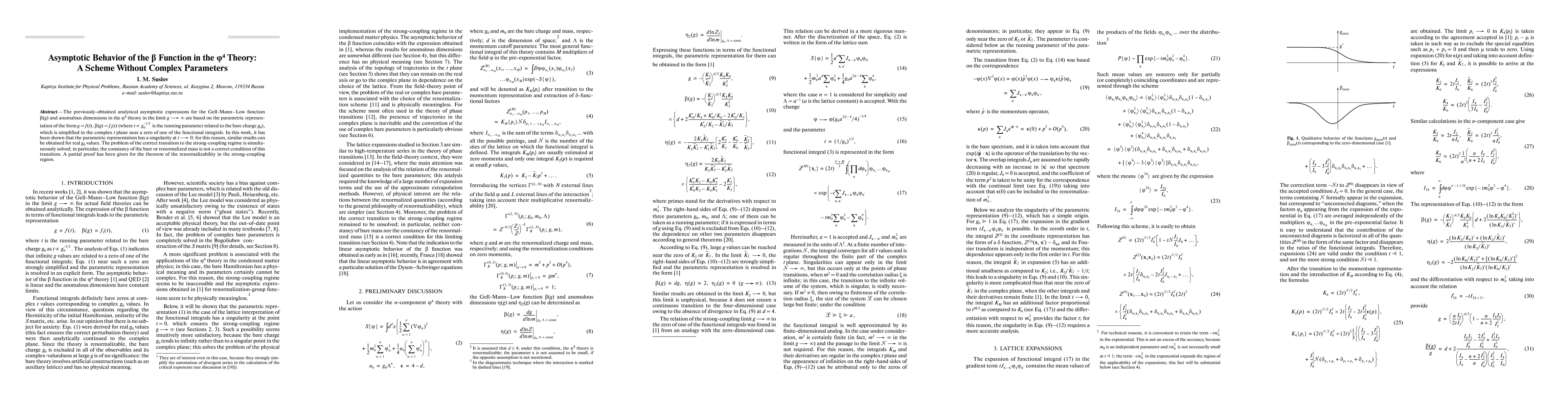 The previously obtained analytical asymptotic expressions for the Gell-Mann - Low function \beta(g) and anomalous dimensions of \phi^4 theory in the limit g\to\infty are based on the parametric representation of the form g = f(t), \beta(g) = f1(t) (where t\sim g_0^{-1/2} is the running parameter related to the bare charge g_0), which is simplified in the complex t plane near a zero of one of the functional integrals. In the present paper, it is shown that the parametric representation has a singularity at t\to 0; for this reason, similar results can be obtained for real values of g_0. The problem of the correct transition to the strong coupling regime is simultaneously solved; in particular, the constancy of the bare or renormalized mass is not a correct condition of this transition. A partial proof is given for the theorem of the renormalizability in the strong coupling region.