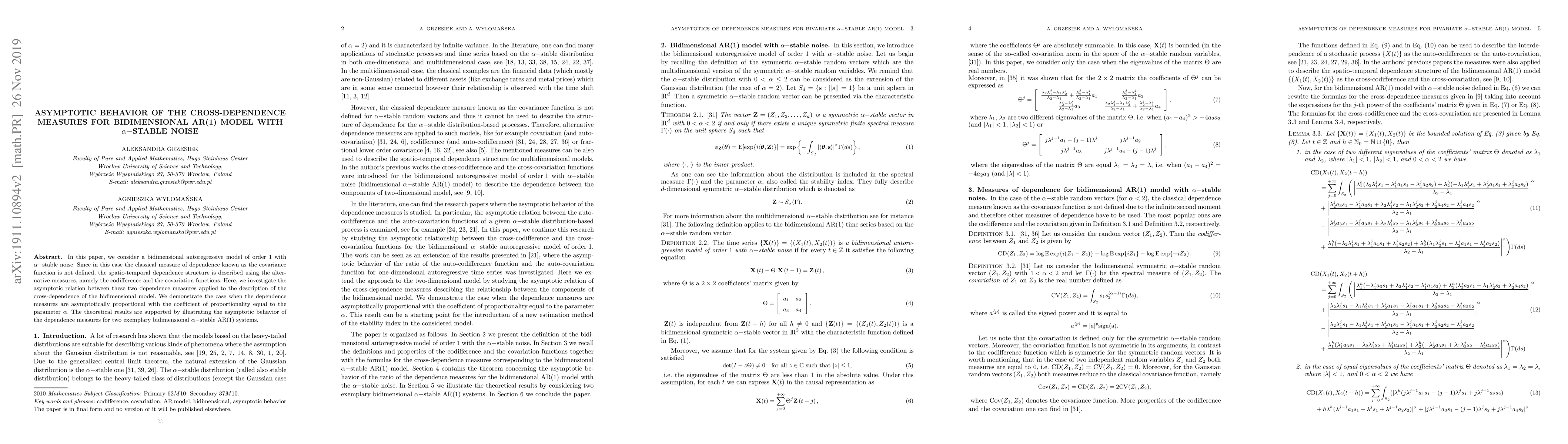 In this paper, we consider a bidimensional autoregressive model of order 1 with $\alpha-$stable noise. Since in this case the classical measure of dependence known as the covariance function is not defined, the spatio-temporal dependence structure is described using the alternative measures, namely the codifference and the covariation functions. Here, we investigate the asymptotic relation between these two dependence measures applied to the description of the cross-dependence of the bidimensional model. We demonstrate the case when the dependence measures are asymptotically proportional with the coefficient of proportionality equal to the parameter $\alpha$. The theoretical results are supported by illustrating the asymptotic behavior of the dependence measures for two exemplary bidimensional $\alpha-$stable AR(1) systems.