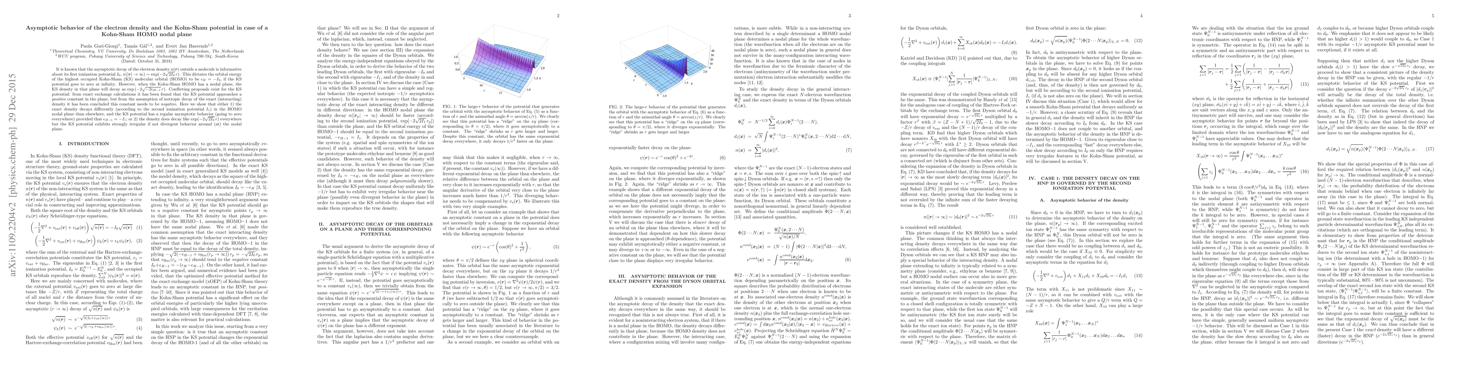 This paper investigates the asymptotic behavior of electron density and the Kohn-Sham potential in the presence of a nodal plane in the highest occupied molecular orbital (HOMO). It concludes that either the exact density decays differently in the nodal plane or the Kohn-Sham potential exhibits irregular behavior around the nodal plane, challenging existing proposals.