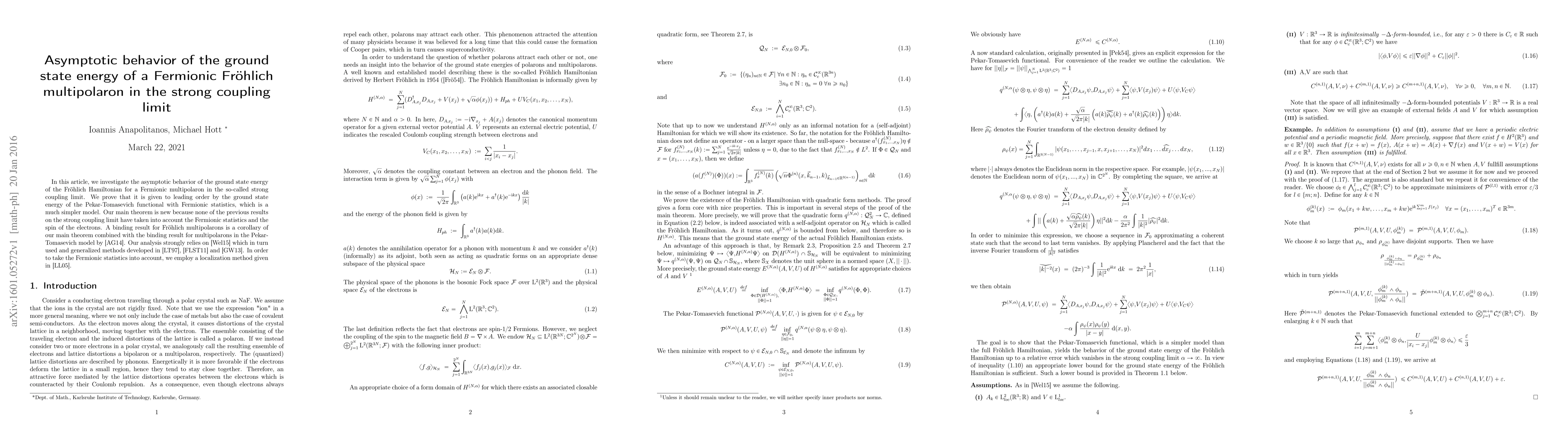 This paper examines the ground state energy of a Fermionic multipolaron under strong coupling conditions, showing that it is asymptotically given by the simpler Pekar-Tomasevich functional with Fermionic statistics. The study introduces a novel binding result for Fr\"ohlich multipolarons, extending previous work that did not consider Fermionic statistics or electron spin.