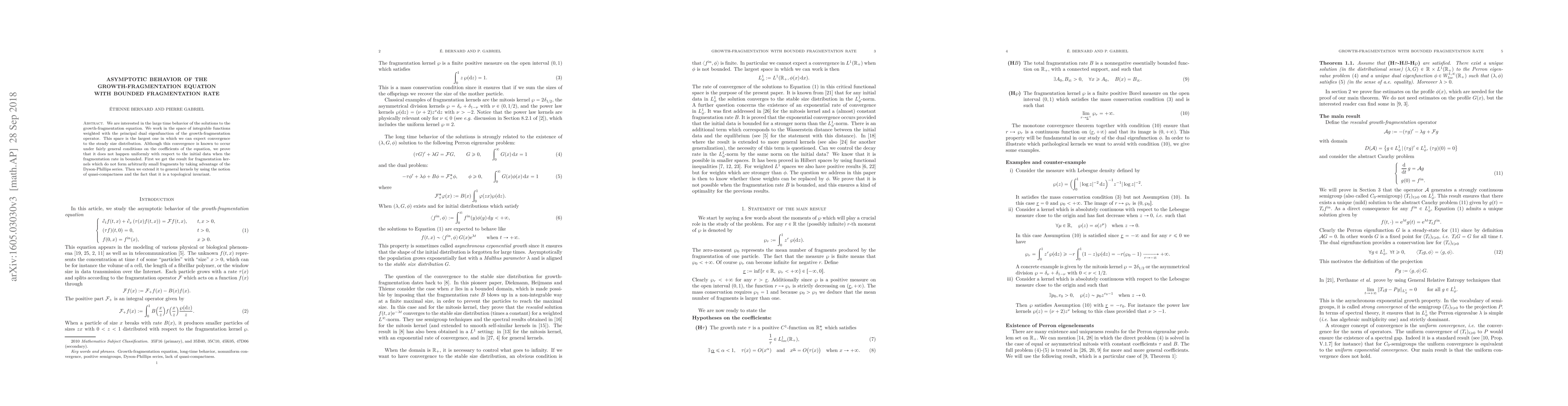 This paper investigates the asymptotic behavior of solutions to the growth-fragmentation equation, demonstrating that convergence to the steady size distribution occurs under general conditions but is not uniform with respect to initial data when the fragmentation rate is bounded. The study leverages the Dyson-Phillips series and quasi-compactness to extend results from non-arbitrarily small fragment kernels to general kernels.