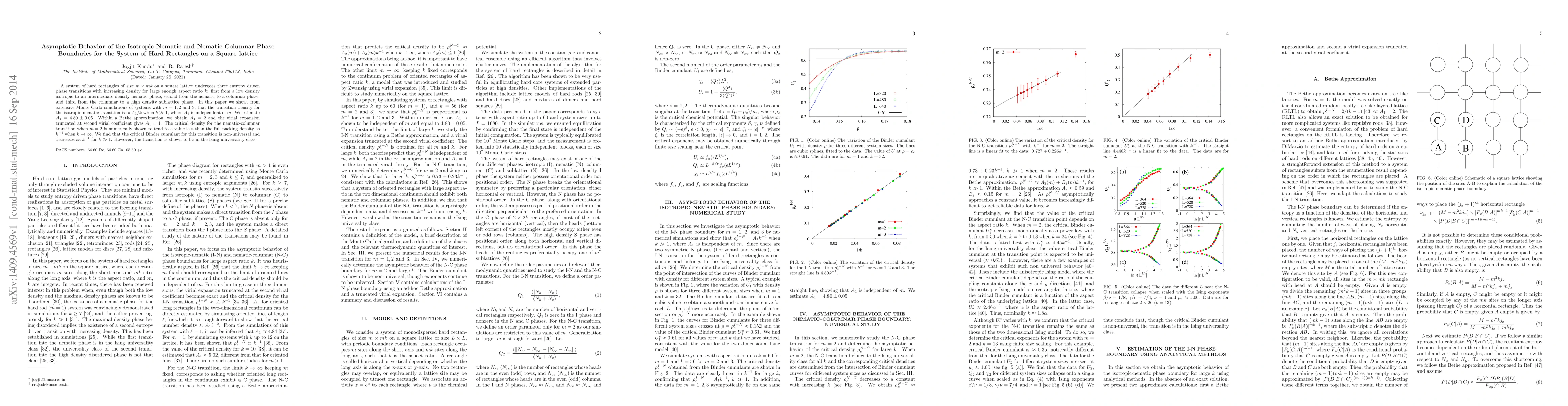 This paper explores the phase transitions in a system of hard rectangles on a square lattice, revealing the asymptotic behavior of the transition densities for the isotropic-nematic and nematic-columnar phase boundaries. Monte Carlo simulations show the isotropic-nematic transition density scales as $A_1/k$ with $A_1 \approx 4.80 \pm 0.05$, while the nematic-columnar transition density tends to a value less than full packing density as $k^{-1}$ for large aspect ratios.