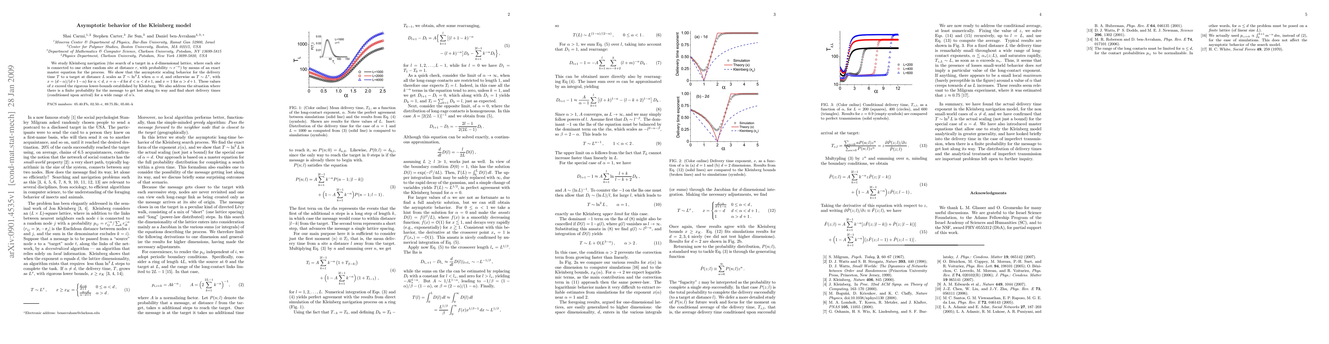 This paper investigates the asymptotic behavior of Kleinberg's navigation model on a d-dimensional lattice, revealing the scaling of delivery time T with distance L, which varies based on the parameter a. The study finds that T scales as (ln L)^2 when a=d, and as L^x for other values of a, exceeding previously established lower-bounds. It also examines scenarios with a finite probability of message loss, showing short delivery times under certain conditions.