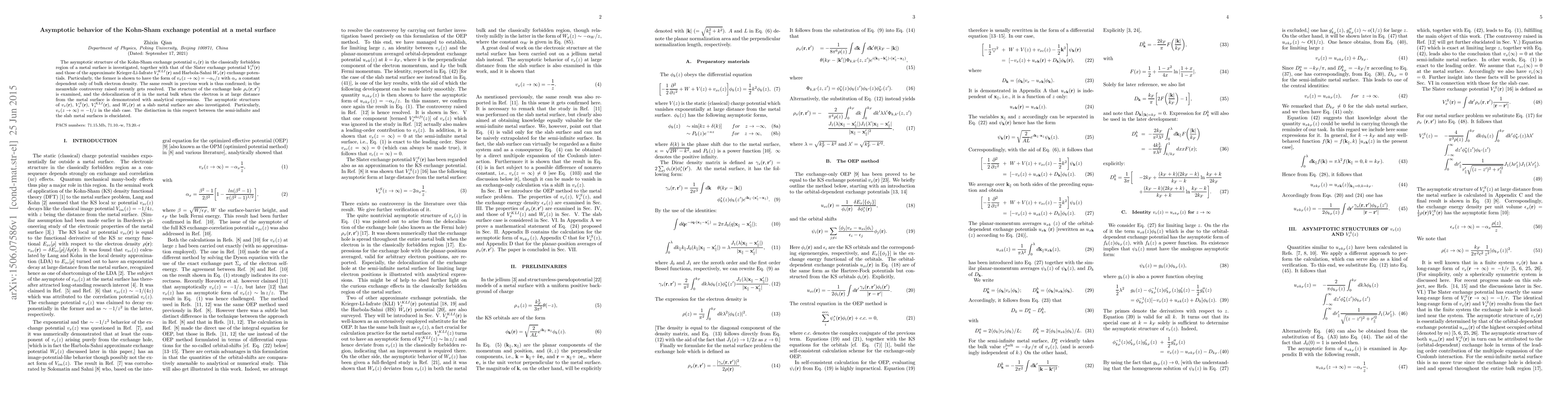 This paper investigates the asymptotic behavior of various Kohn-Sham exchange potentials at metal surfaces, confirming that $v_x (z \to \infty) = - \alpha_x / z$ in the forbidden region, with $\alpha_x$ dependent on bulk electron density. It also resolves recent controversies and clarifies the differences in potential structures between semi-infinite and slab metal surfaces.