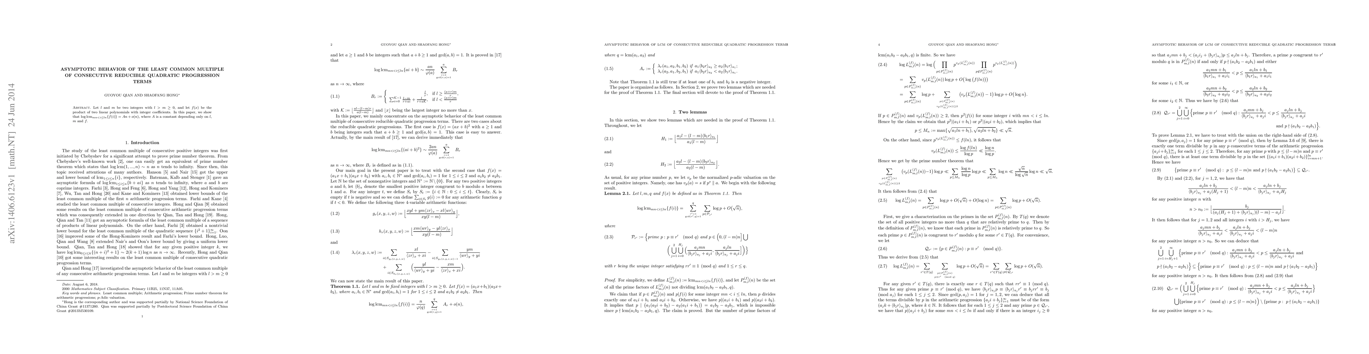 Let $l$ and $m$ be two integers with $l>m\ge 0$, and let $f(x)$ be the product of two linear polynomials with integer coefficients. In this paper, we show that $\log {\rm lcm}_{mn