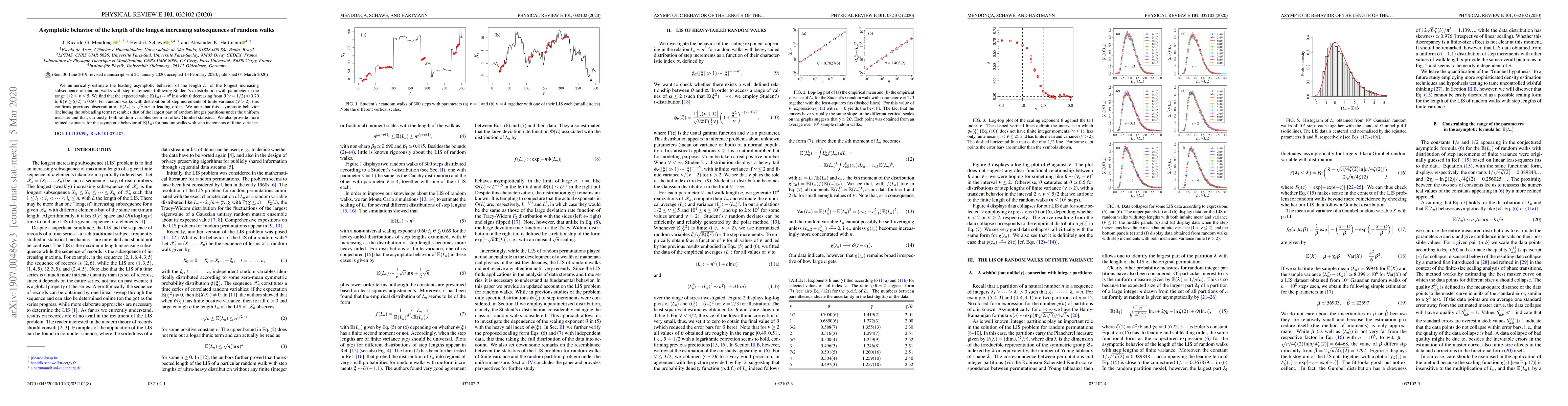 We numerically estimate the leading asymptotic behavior of the length $L_{n}$ of the longest increasing subsequence of random walks with step increments following Student's $t$-distribution with parameter in the range $1/2 \leq \nu \leq 5$. We find that the expected value $\mathbb{E}(L_{n}) \sim n^{\theta}\ln{n}$ with $\theta$ decreasing from $\theta(\nu=1/2) \approx 0.70$ to $\theta(\nu \geq 5/2) \approx 0.50$. For random walks with distribution of step increments of finite variance ($\nu > 2$), this confirms previous observation of $\mathbb{E}(L_{n}) \sim \sqrt{n}\ln{n}$ to leading order. We note that this asymptotic behavior (including the subleading term) resembles that of the largest part of random integer partitions under the uniform measure and that, curiously, both random variables seem to follow Gumbel statistics. We also provide more refined estimates for the asymptotic behavior of $\mathbb{E}(L_{n})$ for random walks with step increments of finite variance.