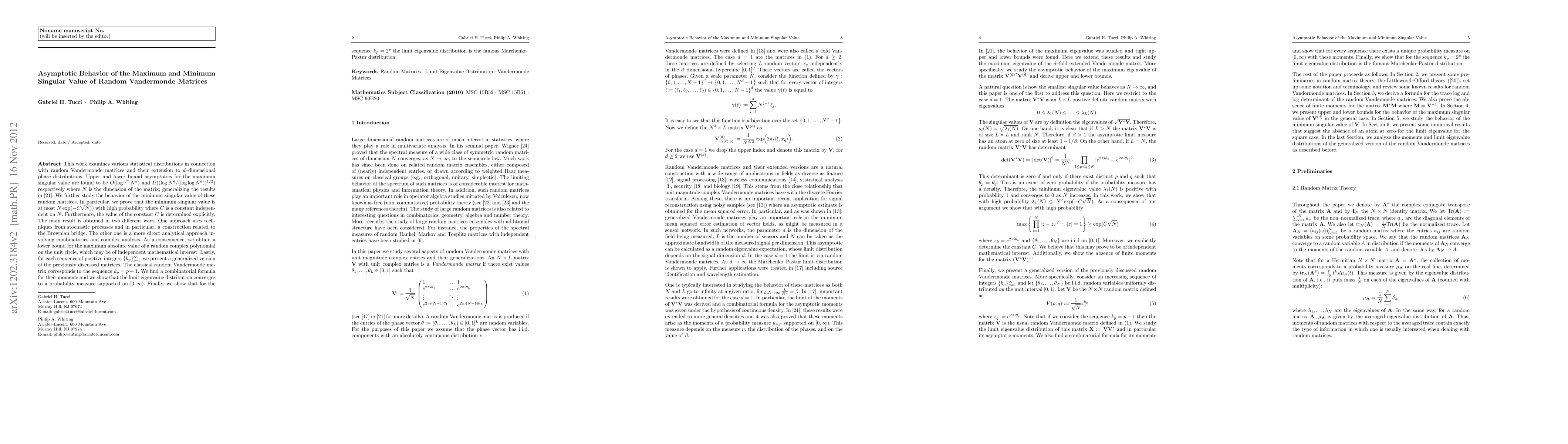 This paper investigates the asymptotic behavior of the singular values of random Vandermonde matrices, deriving upper and lower bounds for the maximum singular value and proving a high-probability bound for the minimum singular value. The study employs techniques from stochastic processes and analytical methods, leading to a lower bound for the maximum absolute value of a random complex polynomial on the unit circle.