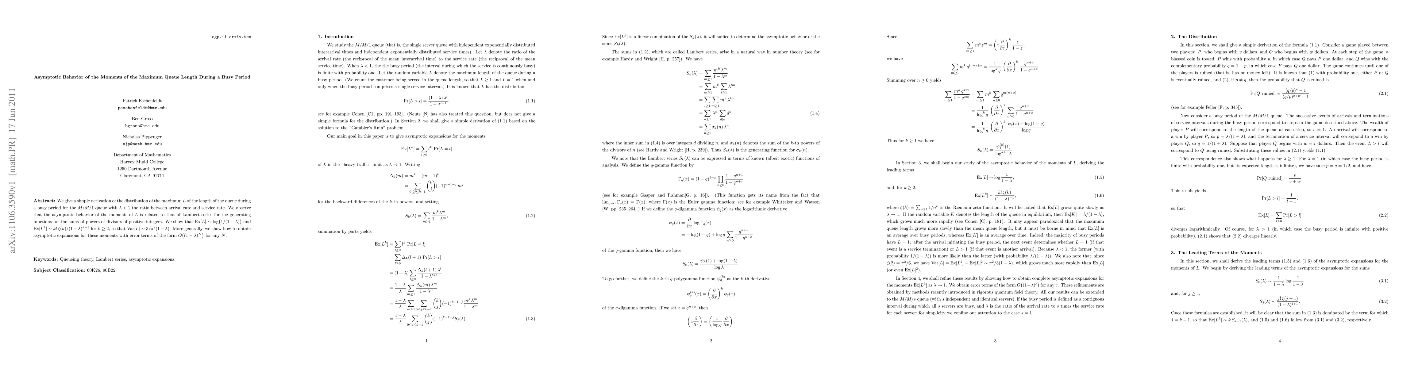 We give a simple derivation of the distribution of the maximum L of the length of the queue during a busy period for the M/M/1 queue with lambda<1 the ratio between arrival rate and service rate. We observe that the asymptotic behavior of the moments of L is related to that of Lambert series for the generating functions for the sums of powers of divisors of positive integers. We show how to obtain asymptotic expansions for these moments with error terms having order as large a power of 1-lambda as desired.