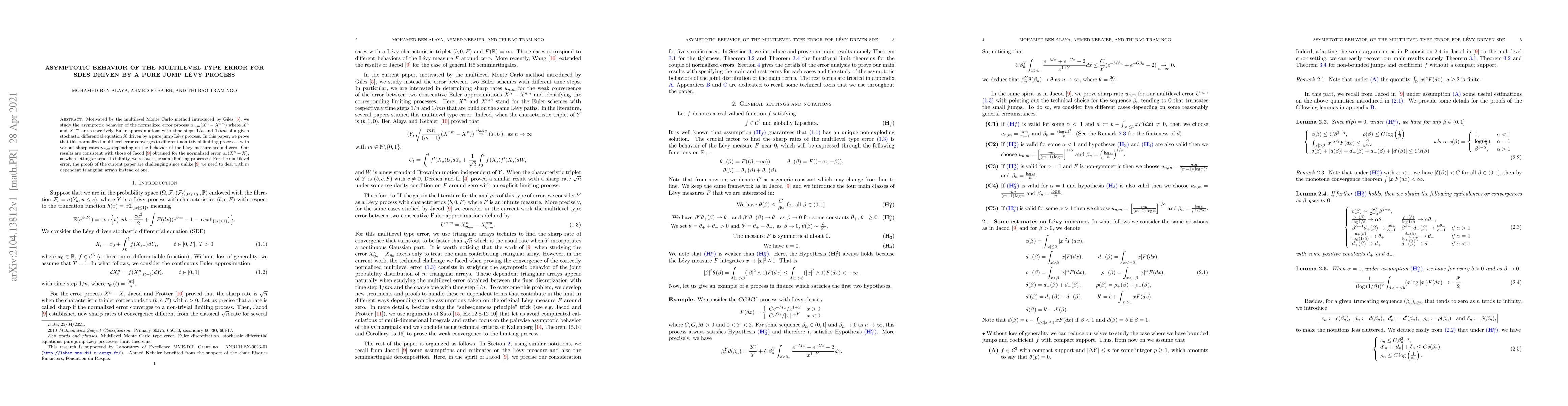 Motivated by the multilevel Monte Carlo method introduced by Giles [5], we study the asymptotic behavior of the normalized error process $u_{n,m}(X^n-X^{nm})$ where $X^n$ and $X^{nm}$ are respectively Euler approximations with time steps $1/n$ and $1/nm$ of a given stochastic differential equation $X$ driven by a pure jump L\'evy process. In this paper, we prove that this normalized multilevel error converges to different non-trivial limiting processes with various sharp rates $u_{n,m}$ depending on the behavior of the L\'evy measure around zero. Our results are consistent with those of Jacod [9] obtained for the normalized error $u_n(X^n-X)$, as when letting $m$ tends to infinity, we recover the same limiting processes. For the multilevel error, the proofs of the current paper are challenging since unlike [9] we need to deal with $m$ dependent triangular arrays instead of one.