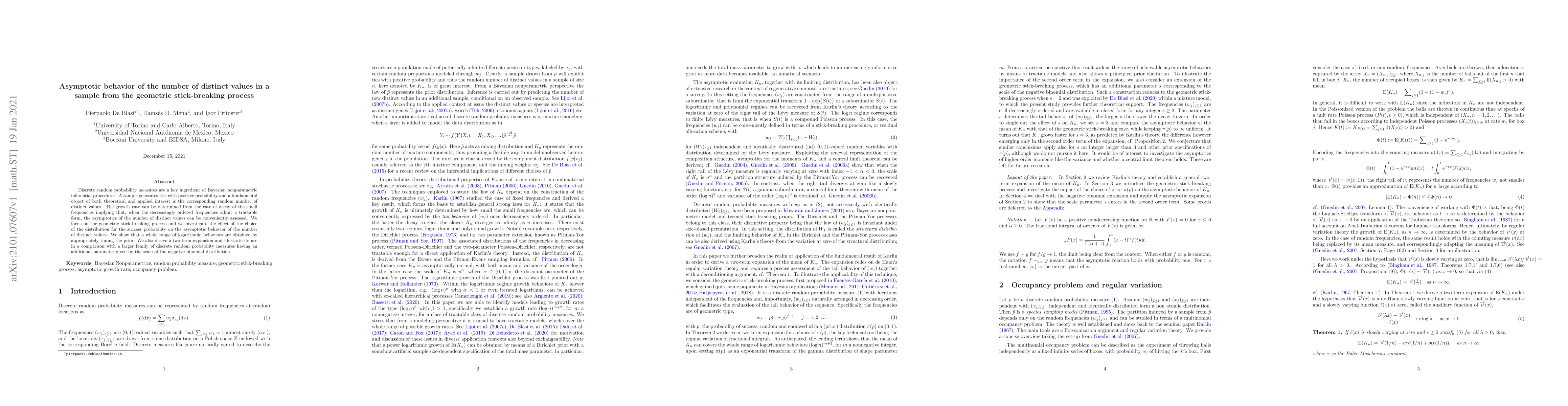 The research paper explores how tuning prior distributions in a geometric stick-breaking process affects the asymptotic behavior of the number of distinct values. It shows that various logarithmic behaviors can be achieved.