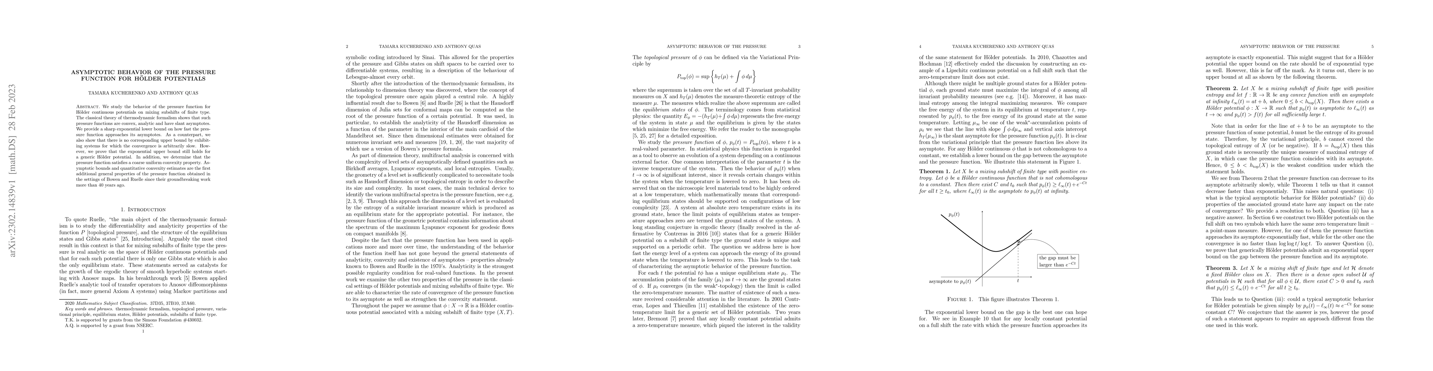 This paper investigates the asymptotic behavior of the pressure function for Hölder continuous potentials on mixing subshifts of finite type, establishing sharp exponential lower bounds for its convergence to asymptotes and demonstrating that no upper bound exists in general. The study also proves the existence of an exponential upper bound for generic potentials and reveals a coarse uniform convexity property of the pressure function.