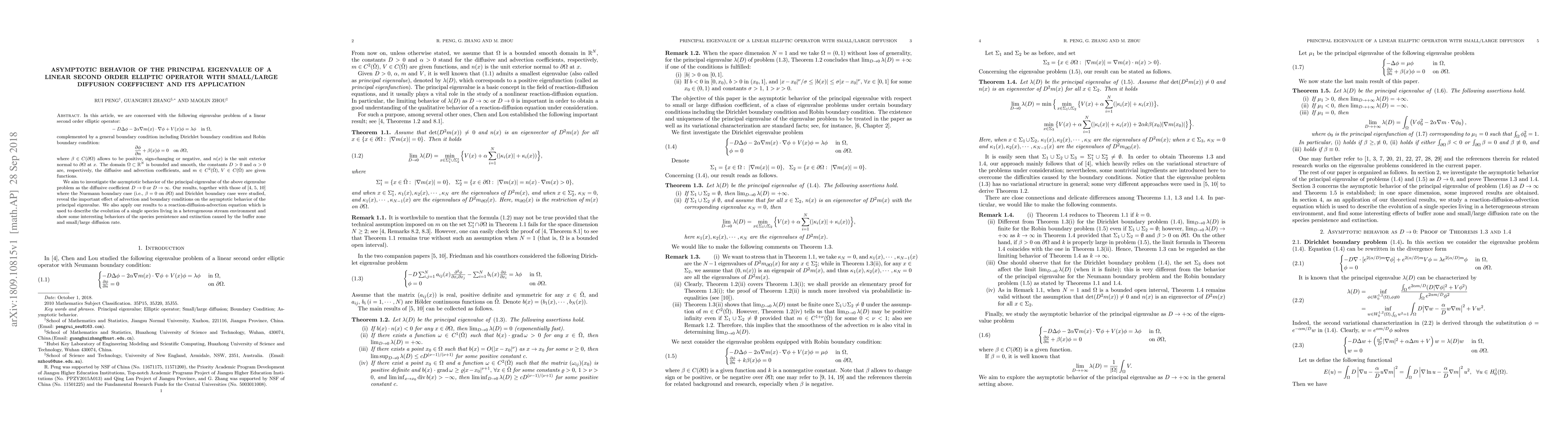 This paper investigates the asymptotic behavior of the principal eigenvalue for a linear second-order elliptic operator under varying diffusion coefficients, considering both small and large diffusion limits. The study reveals the impact of advection and boundary conditions on the eigenvalue's behavior and applies these findings to a reaction-diffusion-advection equation modeling species persistence in a heterogeneous environment.