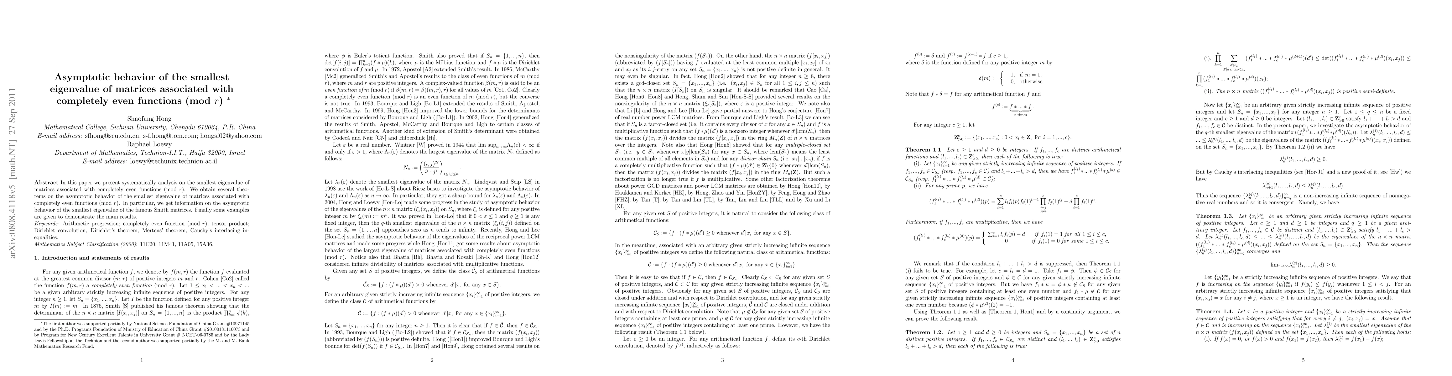 This paper systematically analyzes the asymptotic behavior of the smallest eigenvalue of matrices linked to completely even functions modulo $r$, deriving several theorems and providing insights into the asymptotic behavior of Smith matrices, with illustrative examples.