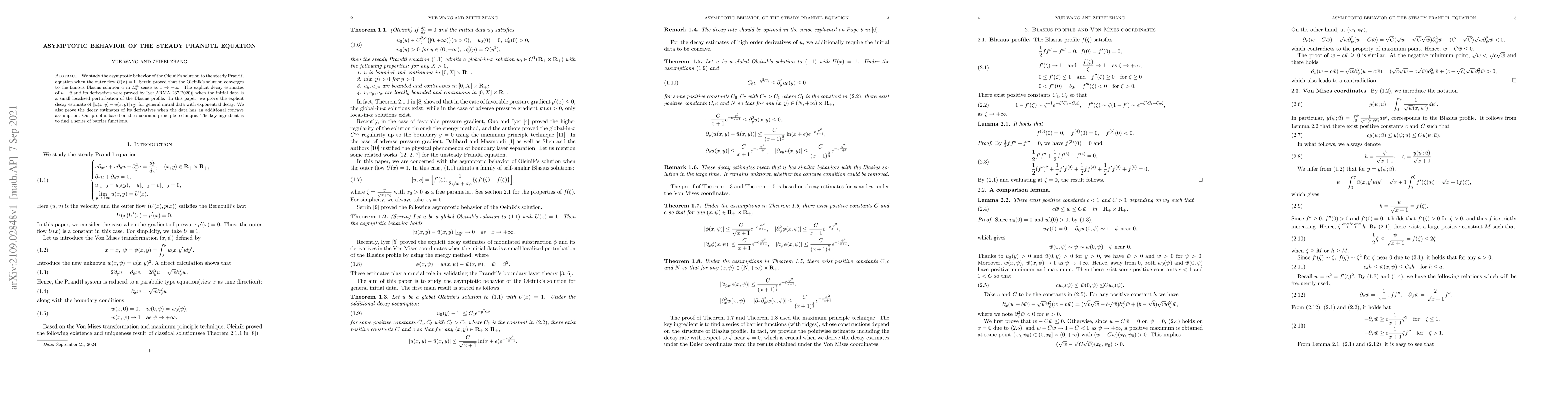 This paper investigates the asymptotic behavior of Oleinik's solution to the steady Prandtl equation under the outer flow $U(x)=1$. It proves explicit decay estimates for the difference between the solution and the Blasius solution, extending results for small perturbations to general initial data with exponential decay, and utilizes the maximum principle and barrier functions in the proof.