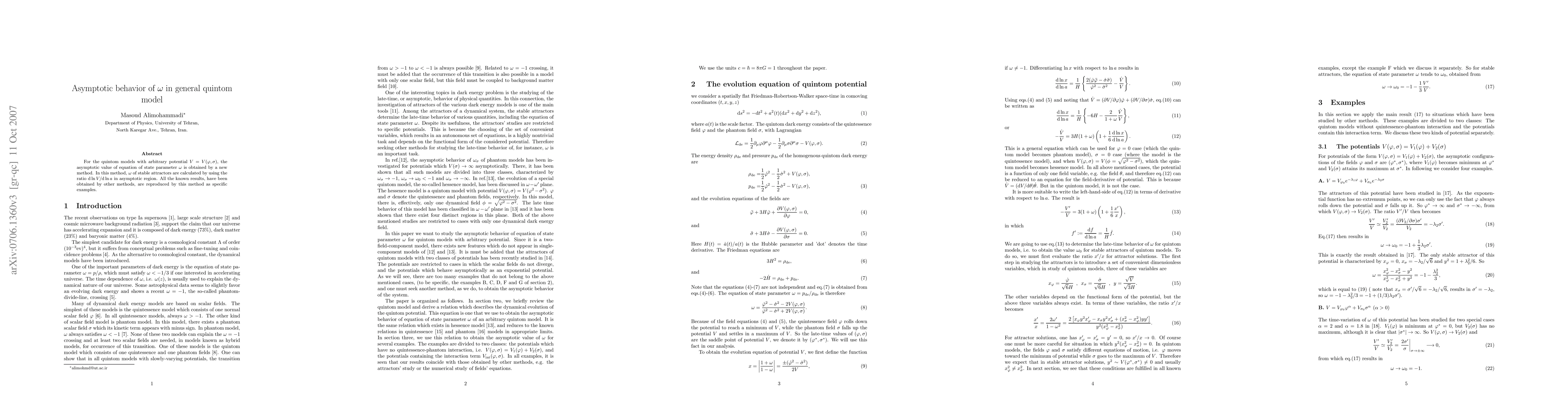 This paper presents a novel method for determining the asymptotic value of the equation of state parameter \( w \) in general quintom models, where \( w \) is calculated using the ratio \( \frac{d \ln V}{d \ln a} \) in the asymptotic region. This method reproduces known results from previous studies.