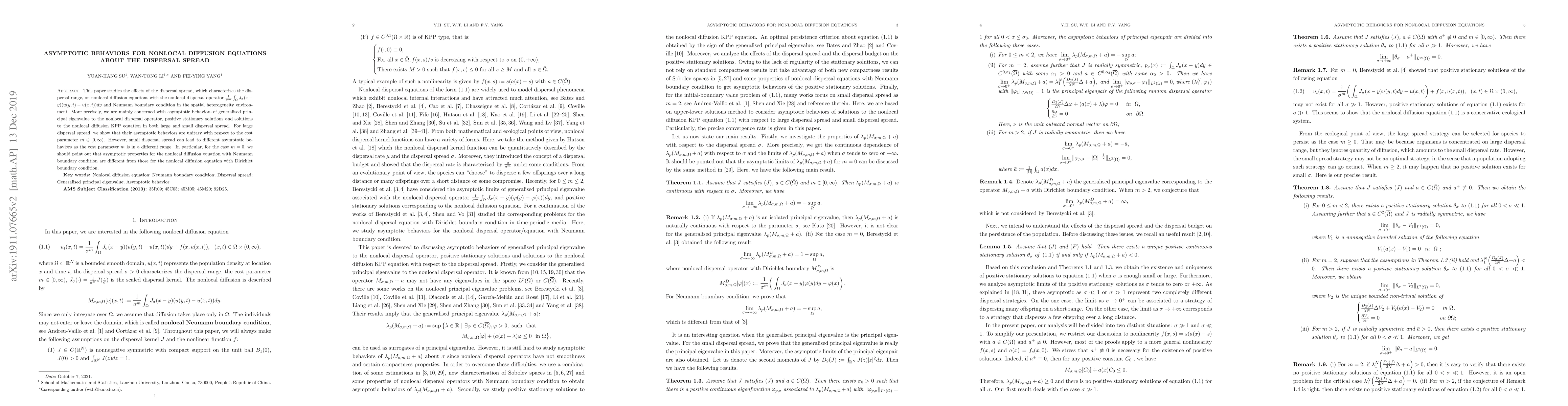 This paper investigates the impact of dispersal spread on nonlocal diffusion equations, focusing on the asymptotic behaviors of principal eigenvalues, stationary solutions, and KPP equations under varying dispersal ranges. For large dispersal spread, the behaviors remain uniform, while small dispersal spread yields different results depending on the cost parameter $m$. Notably, $m=0$ leads to distinct asymptotic properties for Neumann versus Dirichlet boundary conditions.