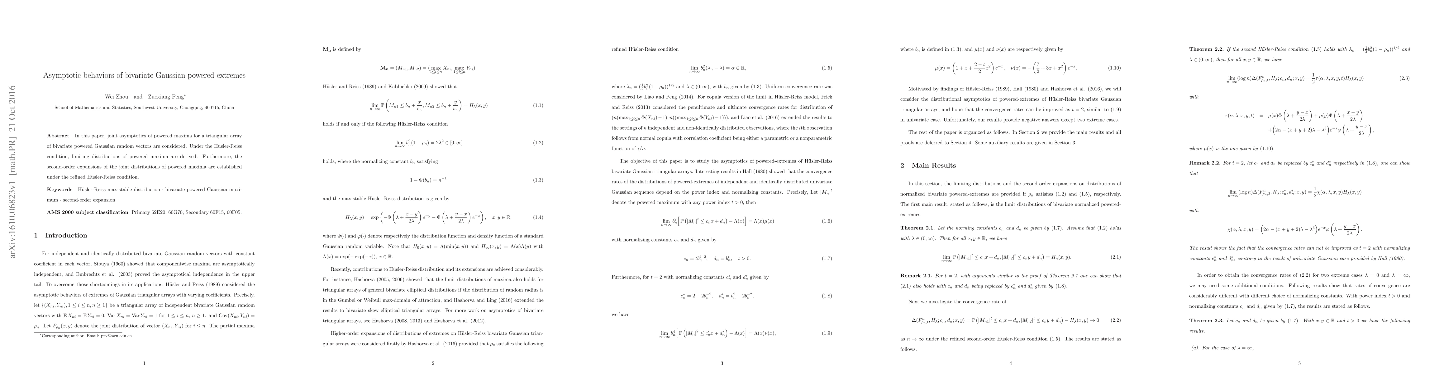 This paper derives the limiting distributions of powered maxima for bivariate Gaussian random vectors under the Hüsler-Reiss condition and establishes second-order expansions for their joint distributions under a refined Hüsler-Reiss condition.