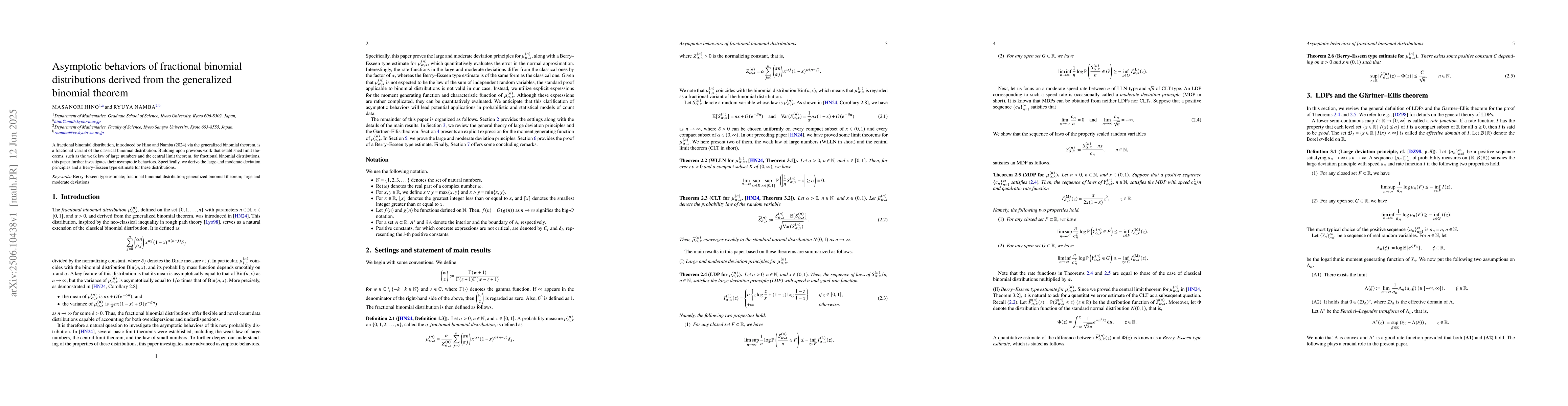 This research derives asymptotic behaviors of fractional binomial distributions, including large and moderate deviation principles and a Berry--Esseen type estimate, based on the generalized binomial theorem introduced by Hino and Namba (2024).