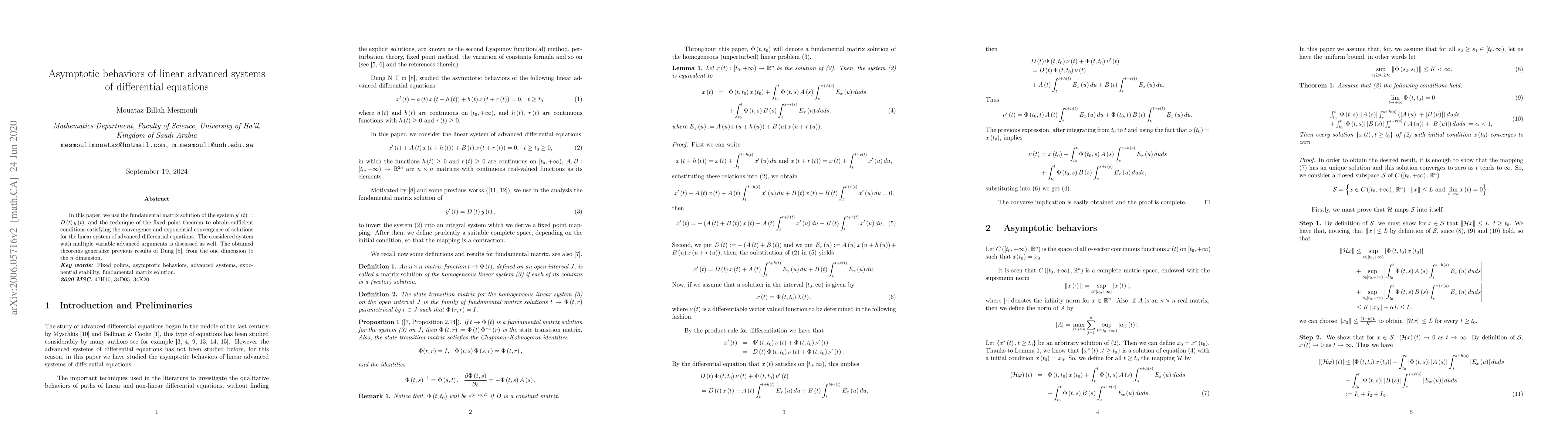 This paper uses a Banach fixed point theorem to study the convergence of solutions for linear advanced systems of differential equations, extending previous results from one dimension to n dimensions.