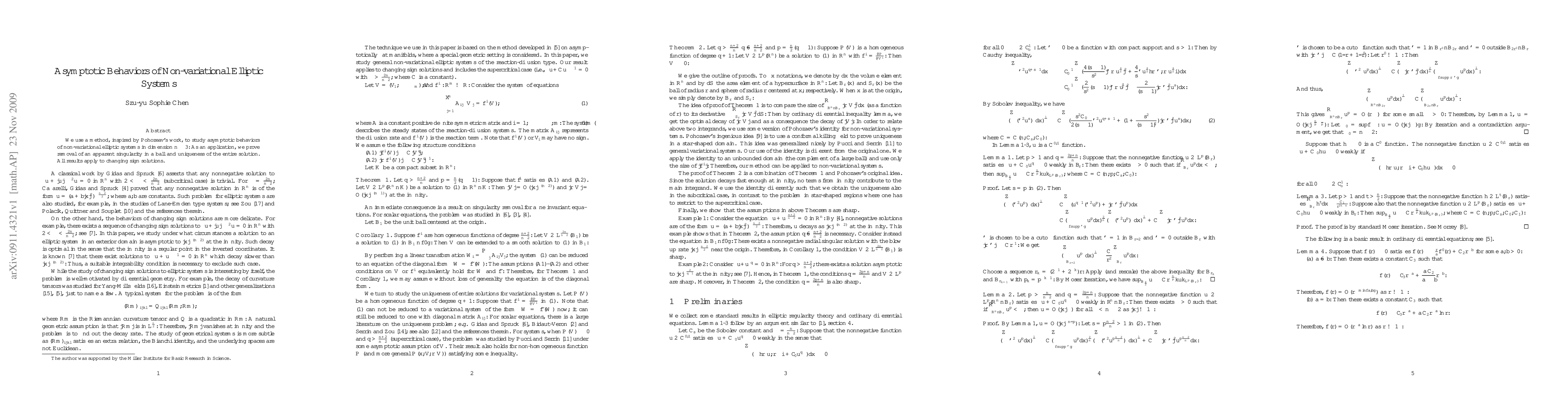 Summary: This paper employs a method inspired by Pohozaev's work to investigate the asymptotic behaviors of non-variational elliptic systems in dimensions greater than two, focusing on solutions that change sign. The findings provide insights into the behavior of such systems under varying conditions.