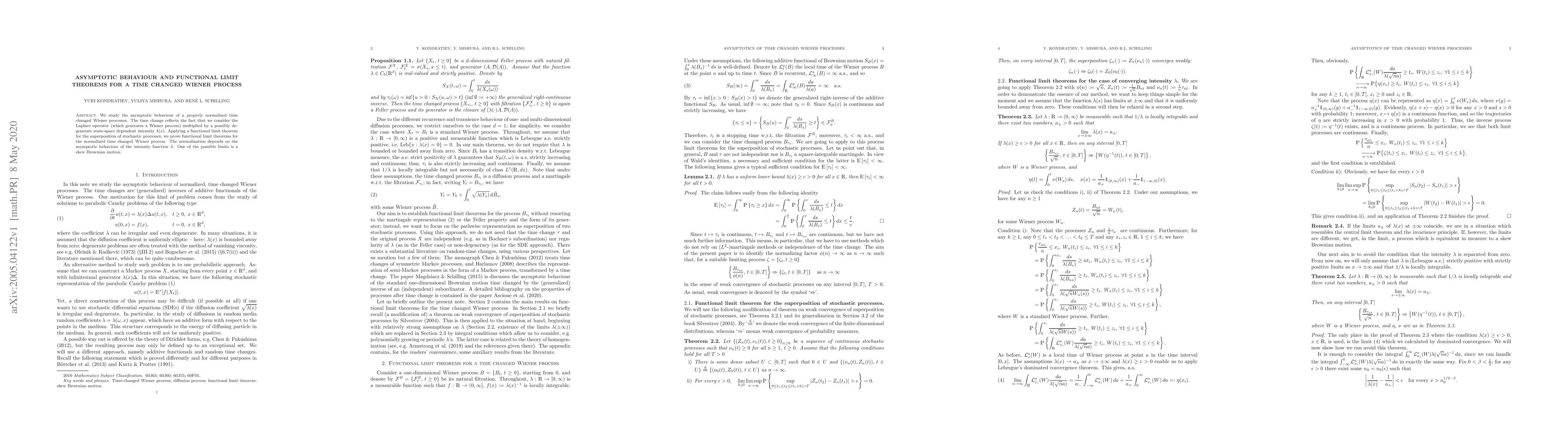We study the asymptotic behaviour of a properly normalized time changed Wiener processes. The time change reflects the fact that we consider the Laplace operator (which generates a Wiener process) multiplied by a possibly degenerate state-space dependent intensity $\lambda(x)$. Applying a functional limit theorem for the superposition of stochastic processes, we prove functional limit theorems for the normalized time changed Wiener process. The normalization depends on the asymptotic behaviour of the intensity function $\lambda$. One of the possible limits is a skew Brownian motion.