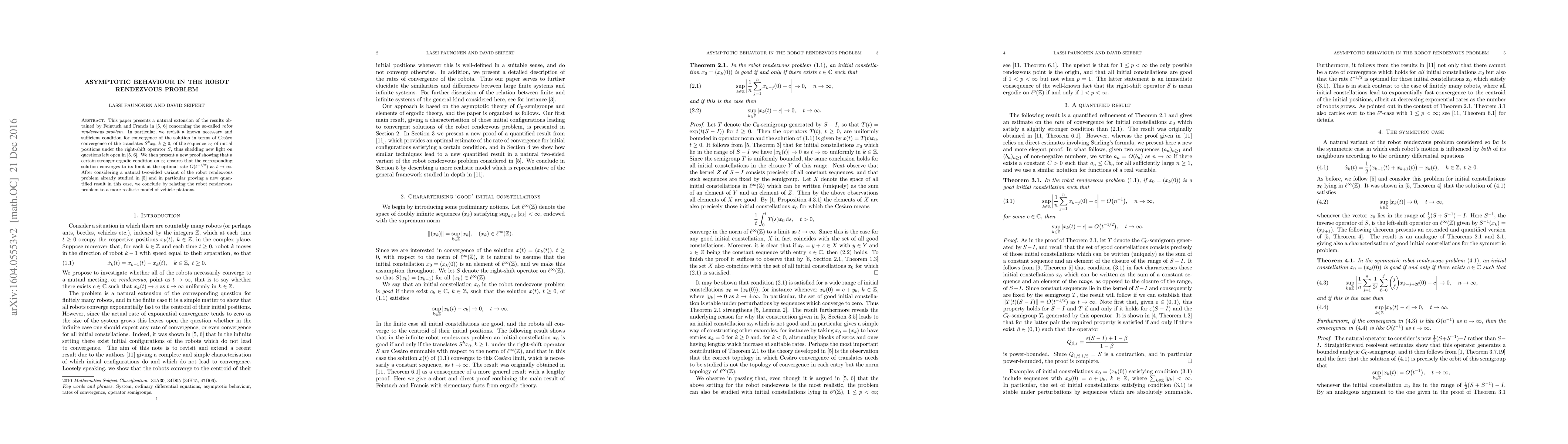 We present a non-technical overview of the results obtained by the authors (2015) concerning the so-called robot rendezvous problem studied by Feintuch and Francis (2012). In particular, we present a necessary and sufficient condition for convergence of the solution in terms of Ces\`aro convergence of the translates $S^k x_0$, $k\ge0$, of the sequence $x_0$ of initial positions under the right-shift operator $S$, thus shedding new light on questions left open in by Feintuch and Francis. We also formulate a stronger ergodic condition on $x_0$ which ensures that the corresponding solution converges to its limit at the rate $O(t^{-1/2})$ as $t\to\infty$. We conclude with a brief discussion of a natural two-sided variant of the robot rendezvous problem and by relating the robot rendezvous problem to a more realistic model of vehicle platoons, for which the authors' earlier general results lead to analogous statements.