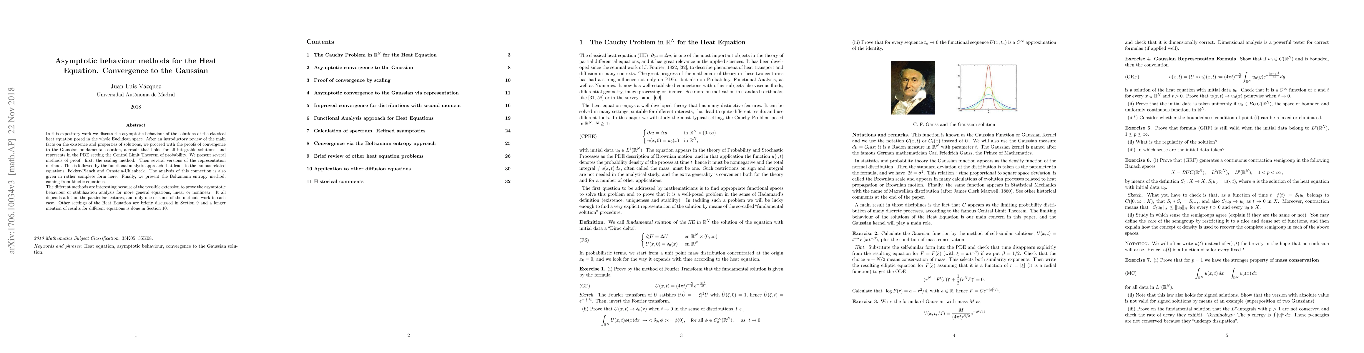In this expository work we discuss the asymptotic behaviour of the solutions of the classical heat equation posed in the whole Euclidean space. After an introductory review of the main facts on the existence and properties of solutions, we proceed with the proofs of convergence to the Gaussian fundamental solution, a result that holds for all integrable solutions, and represents in the PDE setting the Central Limit Theorem of probability. We present several methods of proof: first, the scaling method. Then several versions of the representation method. This is followed by the functional analysis approach that leads to the famous related equations, Fokker-Planck and Ornstein-Uhlenbeck. The analysis of this connection is also given in rather complete form here. Finally, we present the Boltzmann entropy method, coming from kinetic equations. The different methods are interesting because of the possible extension to prove the asymptotic behaviour or stabilization analysis for more general equations, linear or nonlinear. It all depends a lot on the particular features, and only one or some of the methods work in each case.Other settings of the Heat Equation are briefly discussed in Section 9 and a longer mention of results for different equations is done in Section 10.