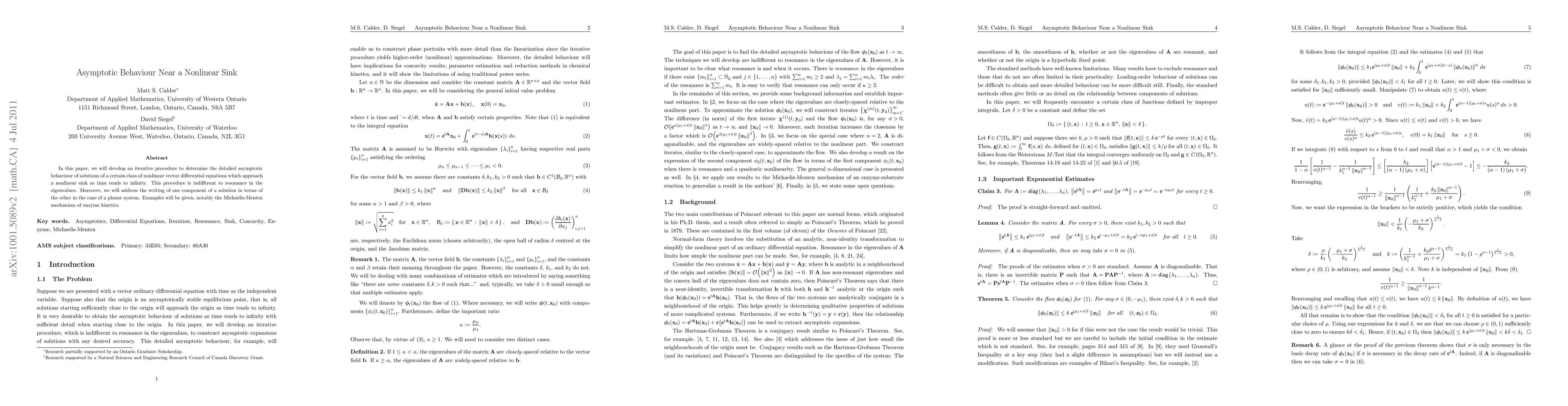 This paper develops an iterative method to analyze the asymptotic behavior of solutions to nonlinear differential equations approaching a nonlinear sink, focusing on systems without resonance in eigenvalues. It also explores expressing one solution component in terms of another for planar systems, illustrated with the Michaelis-Menten enzyme kinetics model.