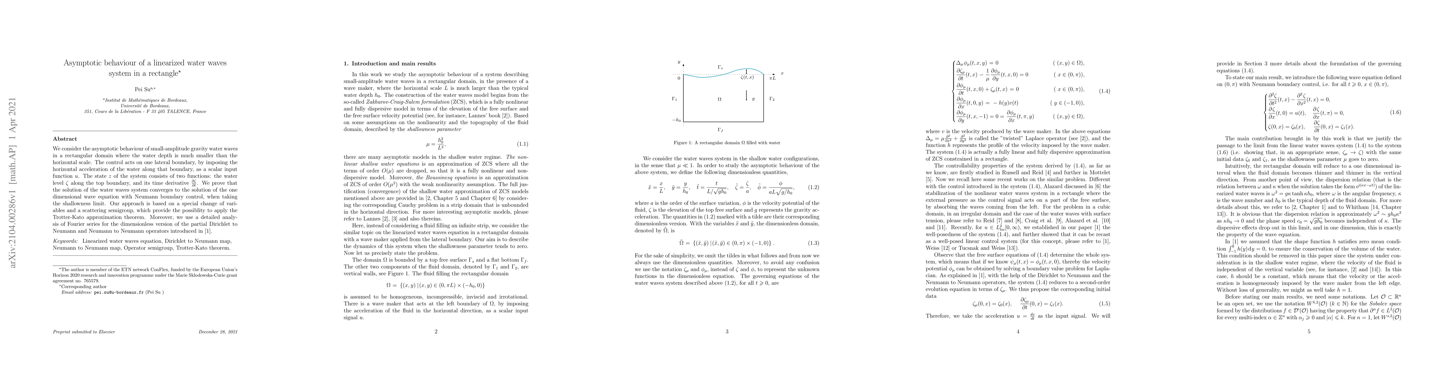 We consider the asymptotic behaviour of small-amplitude gravity water waves in a rectangular domain where the water depth is much smaller than the horizontal scale. The control acts on one lateral boundary, by imposing the horizontal acceleration of the water along that boundary, as a scalar input function u. The state z of the system consists of two functions: the water level $\zeta$ along the top boundary, and its time derivative $\partial$$\zeta$ $\partial$t. We prove that the solution of the water waves system converges to the solution of the one dimensional wave equation with Neumann boundary control, when taking the shallowness limit. Our approach is based on a special change of variables and a scattering semigroup, which provide the possiblity to apply the Trotter-Kato approximation theorem. Moreover, we use a detailed analysis of Fourier series for the dimensionless version of the partial Dirichlet to Neumann and Neumann to Neumann operators introduced in [1].