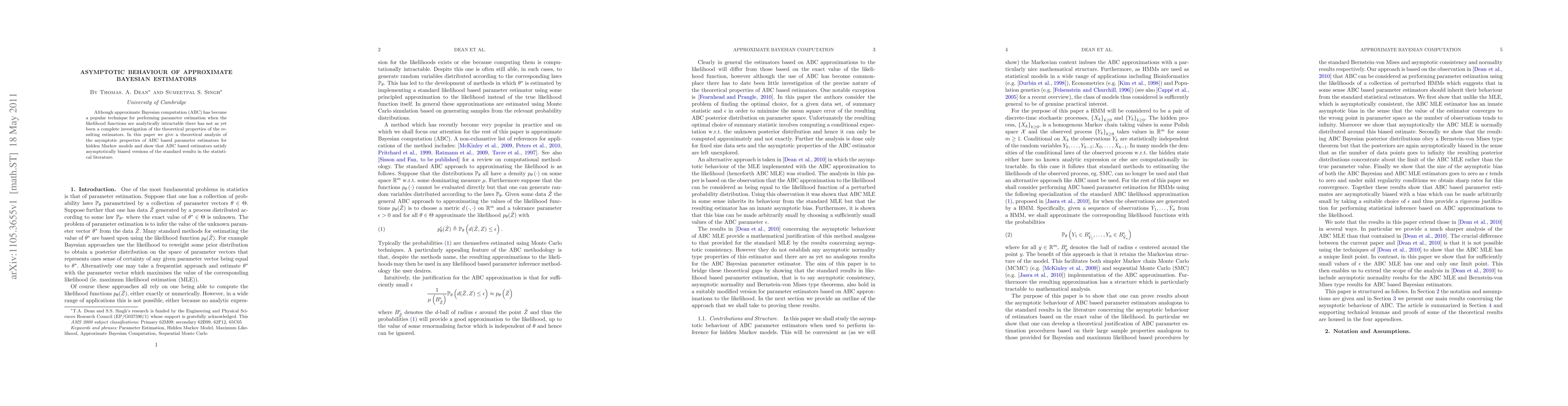 Although approximate Bayesian computation (ABC) has become a popular technique for performing parameter estimation when the likelihood functions are analytically intractable there has not as yet been a complete investigation of the theoretical properties of the resulting estimators. In this paper we give a theoretical analysis of the asymptotic properties of ABC based parameter estimators for hidden Markov models and show that ABC based estimators satisfy asymptotically biased versions of the standard results in the statistical literature.