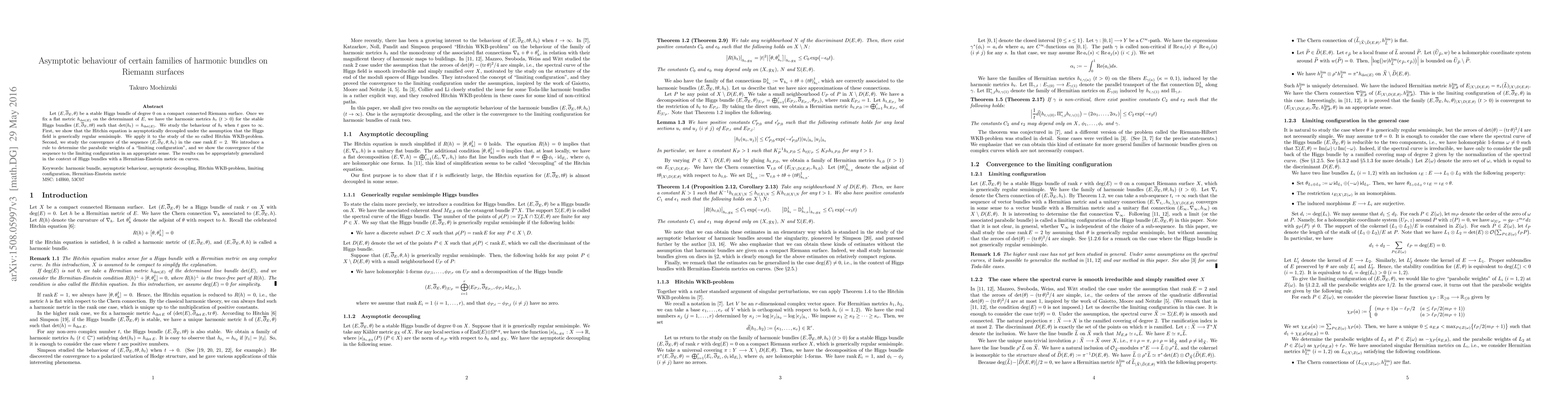 Let $(E,\overline{\partial}_E,\theta)$ be a stable Higgs bundle of degree $0$ on a compact connected Riemann surface. Once we fix the flat metric $h_{\det(E)}$ on the determinant of $E$, we have the harmonic metrics $h_t$ $(t>0)$ for the stable Higgs bundles $(E,\overline{\partial}_E,t\theta)$ such that $\det(h_t)=h_{\det(E)}$. We study the behaviour of $h_t$ when $t$ goes to $\infty$. First, we show that the Hitchin equation is asymptotically decoupled under the assumption that the Higgs field is generically regular semisimple. We apply it to the study of the so called Hitchin WKB-problem. Second, we study the convergence of the sequence $(E,\overline{\partial}_E,\theta,h_t)$ in the case where the rank of $E$ is two. We introduce a rule to determine the parabolic weights of a "limiting configuration", and we show the convergence of the sequence to the limiting configuration in an appropriate sense. The results can be appropriately generalized in the context of Higgs bundles with a Hermitian-Einstein metric on curves.