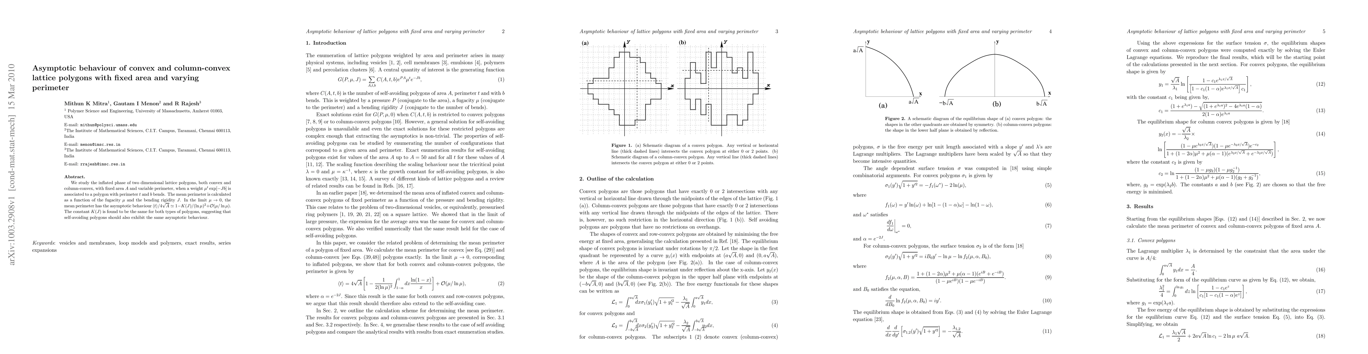 This paper investigates the asymptotic behavior of convex and column-convex lattice polygons with fixed area and varying perimeter, showing that in the limit of low weight, the mean perimeter scales as \( \frac{1}{4} \sqrt{A} \) minus a term dependent on bending rigidity \( J \) and the fugacity \( \mu \). The study finds a common constant \( K(J) \) for both polygon types, implying similar asymptotic behavior for self-avoiding polygons.